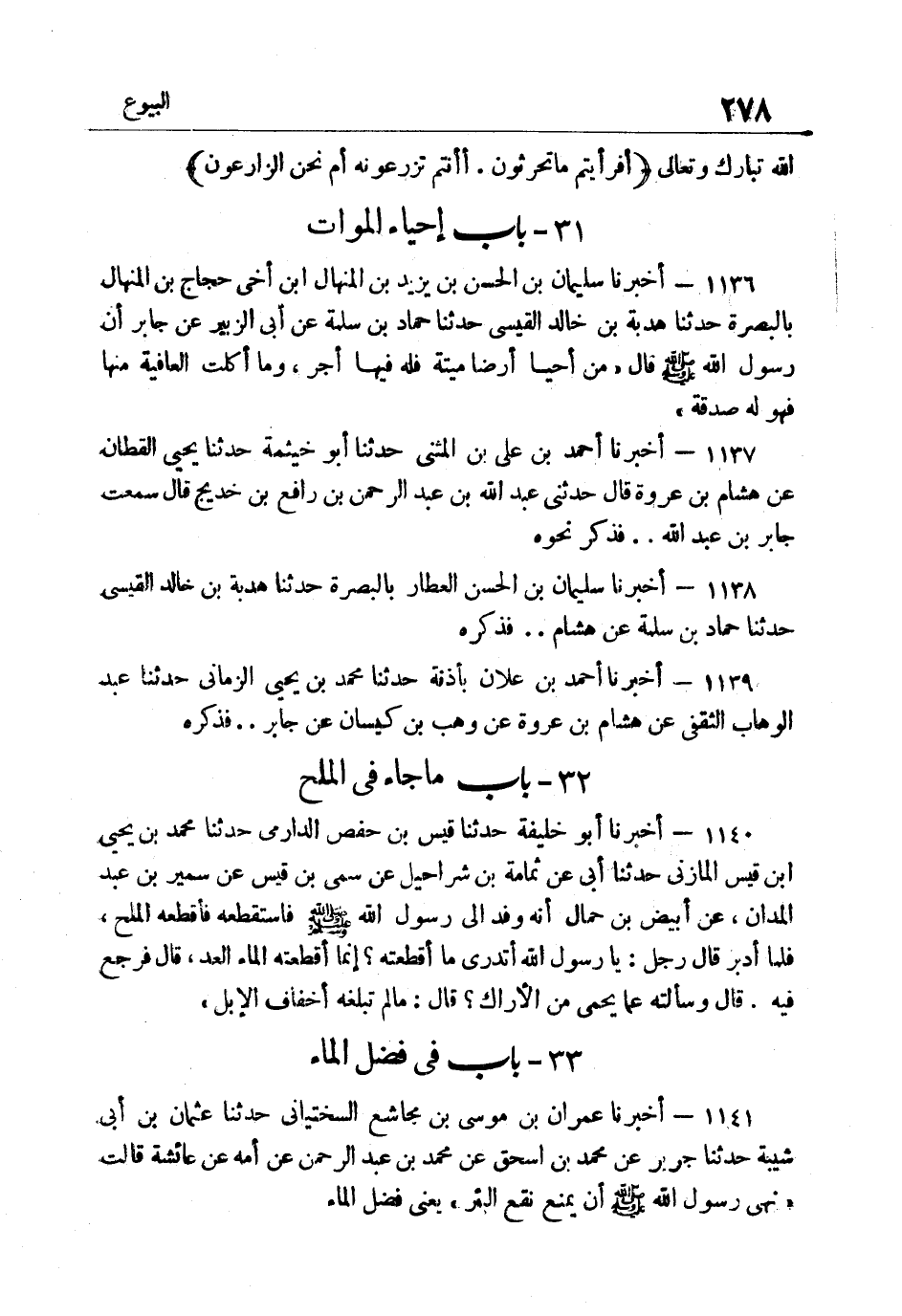 1136- أَخْبَرَنَا سُلَيْمَانُ بْنُ الْحَسَنِ بْنِ يَزِيدَ بْنَ الْمنْهَال ابْن أخي حجاج بْنِ الْمِنْهَالِ بِالْبَصْرَةِ حَدَّثَنَا هُدْبَةُ بْنُ خَالِدٍ الْقَيْسِيُّ حَدَّثَنَا حَمَّادُ بْنِ سَلَمَةَ عَنْ أَبِي الزُّبَيْرِ عَنْ جَابِرٍ أَنّ رَسُولَ اللَّهِ صَلَّى اللهُ عَلَيْهِ وَسَلَّمَ قَالَ: "مَنْ أَحْيَا أَرْضًا مَيْتَةً فَلَهُ فِيهَا أَجْرٌ وَمَا أَكَلَتِ الْعَافِيَةُ مِنْهَا فَهُوَ لَهُ صَدَقَة".