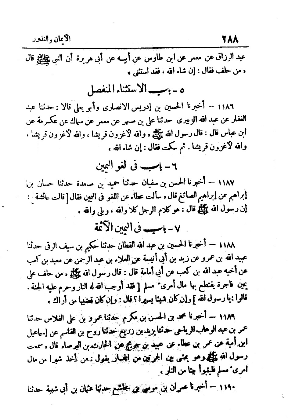 عَبْدُ الرَّزَّاقِ عَنْ مَعْمَرٌ عَنِ ابْنِ طَاوُسٍ عَنْ أَبِيهِ عَنِ أَبِي هُرَيْرَةَ أَنّ النَّبِيَّ صَلَّى اللهُ عَلَيْهِ وَسَلَّمَ قَالَ: "مَنْ حَلَفَ فَقَالَ إِن شَاءَ الله فقد اسْتثْنى".