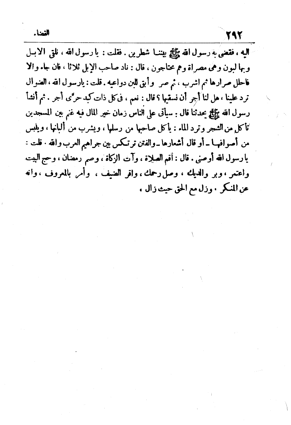 إِلَيْهِ فَقضى بِهِ رَسُولُ اللَّهِ صَلَّى اللهُ عَلَيْهِ وَسَلَّمَ بَيْننَا شطرين فَقلت يَا رَسُولَ اللَّهِ نَلْقَى الإِبِلَ وَبِهَا لَبُونٌ وَهِي مصراة وهم محتاجون قَالَ: "نَاد صَاحِبَ الإِبِلِ ثَلاثًا فَإِنْ جَاءَ وَإِلا فَاحْلُلْ صِرَارَهَا ثُمَّ اشْرَبْ ثُمَّ صُرَّ وَأَبْقِ لِلَّبَنِ دَوَاعِيَهُ" قُلْتُ يَا رَسُولَ اللَّهِ الضَّوَالُّ تَرِدُ عَلَيْنَا هَلْ لَنَا أَجْرٌ أَنْ نَسْقِيَهَا قَالَ: "نَعَمْ فِي كُلِّ ذَاتِ كَبِدٍ حَرَّى أَجْرٌ" ثُمَّ أَنْشَأَ رَسُولُ اللَّهِ صَلَّى اللهُ عَلَيْهِ وَسَلَّمَ يُحَدِّثُنَا قَالَ: "سَيَأْتِي عَلَى النَّاسِ زَمَانٌ خَيْرُ الْمَالِ فِيهِ غَنَمٌ بَيْنَ الْمَسْجِدَيْنِ تَأْكُلُ مِنَ الشَّجَرِ وَتَرِدُ الْمَاءَ يَأْكُلُ صَاحِبُهَا مِنْ رسلها وَيشْرب من أَلْبَانهَا ويلبس من أصوافها أَو قَالَ أشعارها والفتن ترتكس بَين جراهيم الْعَرَبِ وَاللَّهِ". قُلْتُ يَا رَسُولَ اللَّهِ أَوْصِنِي قَالَ: "أَقِمِ الصَّلاةَ وَآتِ الزَّكَاةَ وَصُمْ رَمَضَانَ وَحُجَّ الْبَيْتَ وَاعْتَمِرْ وَبِرَّ وَالِدَيْكَ وَصِلْ رَحِمَكَ واقر الضَّيْف وَأمر بِالْمَعْرُوفِ وَانْهَ عَنِ الْمُنْكَرِ وَزُلْ مَعَ الْحَقِّ حَيْثُ زَالَ".