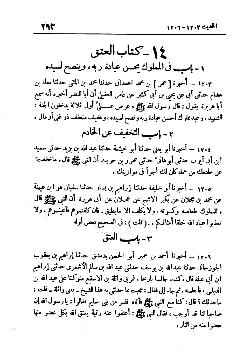 1203- أَخْبَرَنَا عُمَرُ بْنُ مُحَمَّدٍ الْهَمْدَانِيُّ حَدَّثَنَا مُحَمَّدُ بْنُ الْمُثَنَّى حَدَّثَنَا مُعَاذْ بْنُ هِشَامٍ حَدَّثَنِي أَبِي عَنْ يَحْيَى بْنِ أَبِي كَثِيرٍ عَنْ عَامر الْعقيلِيّ أَن أَبَا النَّضر أَخْبَرَهُ أَنَّهُ سَمِعَ أَبَا هُرَيْرَةَ يَقُولُ قَالَ رَسُولُ اللَّهِ صَلَّى اللهُ عَلَيْهِ وَسَلَّمَ: "عُرِضَ عَلَيَّ أَوَّلُ ثَلاثَةٍ يَدْخُلُونَ الْجَنَّةَ الشَّهِيدُ وَعَبْدٌ مَمْلُوكٌ أَحْسَنَ عِبَادَةَ رَبِّهِ وَنَصَحَ لِسَيِّدِهِ وَعَفِيفٌ متعفف ذُو غنى أَو مَال".