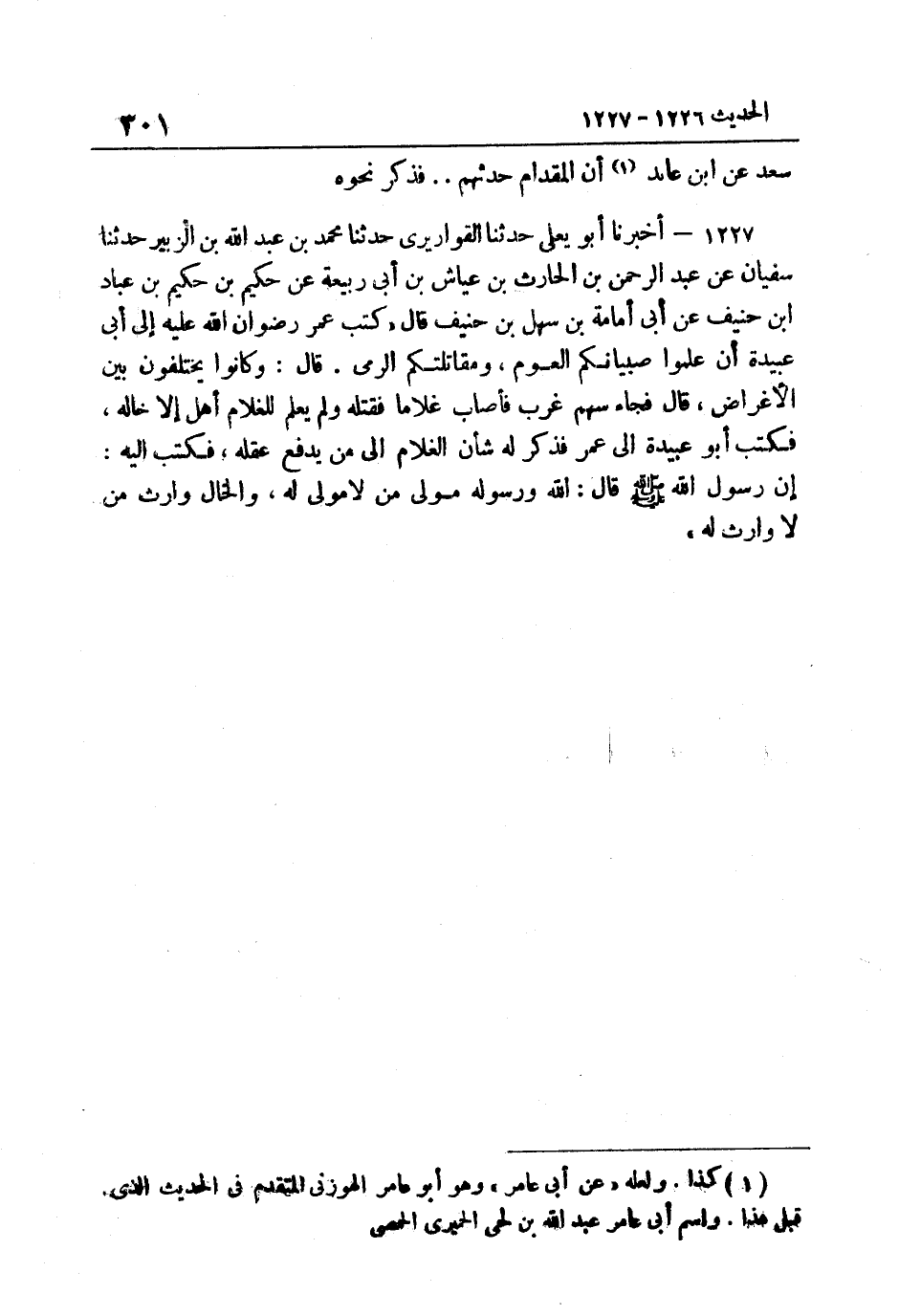 1227- أخبرنَا أَبُو يعلى حَدثنَا القواريري حَدَّثَنَا مُحَمَّدُ بْنُ عَبْدِ اللَّهِ بْنِ الزُّبَيْرِ حَدَّثَنَا سُفْيَانُ عَنْ عَبْدِ الرَّحْمَنِ بْنِ الْحَارِثِ بْنِ عَيَّاشِ بْنِ أَبِي رَبِيعَةَ عَنْ حَكِيمِ بْنُ حَكِيمِ بْنِ عَبَّادِ بْنِ حُنَيْفٍ عَنْ أَبِي أُمَامَةَ بْنِ سَهْلِ بْنِ حُنَيْفٍ قَالَ كتب عمر رضوَان الله عَلَيْهِ إِلَى أَبِي عُبَيْدَةَ أَنْ عَلِّمُوا صِبْيَانَكُمُ الْعَوْمَ ومقاتلتكم الرَّمْي قَالَ وَكَانُوا يَخْتَلِفُونَ بَيْنَ الأَغْرَاضِ قَالَ فَجَاءَ سَهْمٌ غَرْبٌ فَأَصَابَ غُلامًا فَقَتَلَهُ وَلَمْ يُعْلَمْ لِلْغُلامِ أَهْلٌ إِلا خَالُهُ فَكَتَبَ أَبُو عُبَيْدَةَ إِلَى عُمَرَ فَذَكَرَ لَهُ شَأْنَ الْغُلامِ إِلَى مَنْ يَدْفَعُ عَقْلَهُ فَكَتَبَ إِلَيْهِ أَنَّ رَسُولَ اللَّهِ صَلَّى اللهُ عَلَيْهِ وَسَلَّمَ قَالَ: "اللَّهُ وَرَسُولُهُ مَوْلَى مَنْ لَا مَوْلَى لَهُ وَالْخَالُ وَارِثُ مَنْ لَا وَارِث لَهُ".