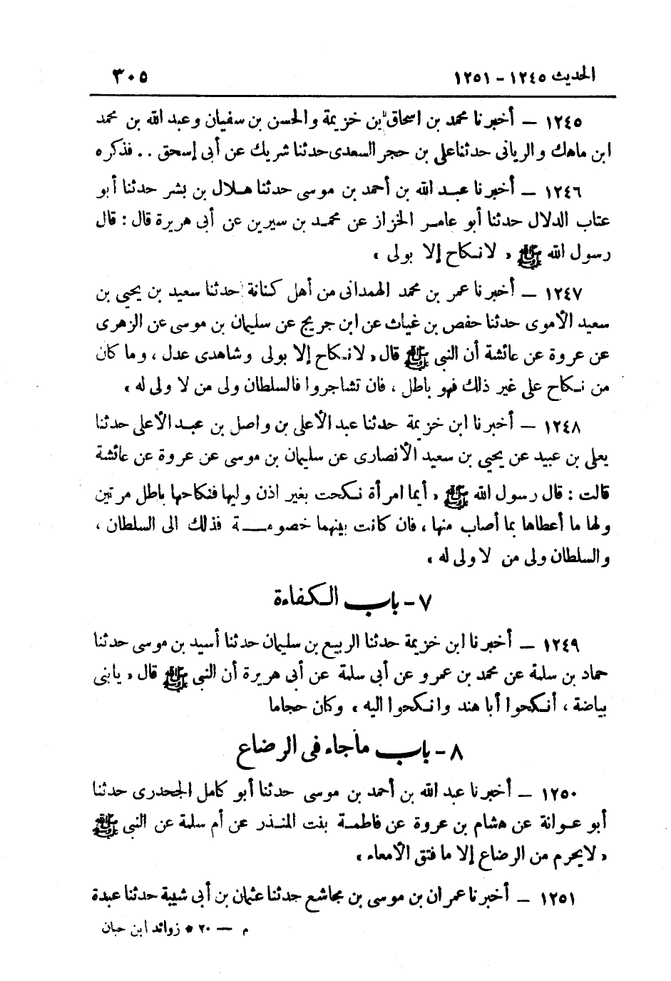 1247- أخبرنَا عمر بن مُحَمَّد الْهَمدَانِي من أهل كنَانَة حَدَّثَنَا سَعِيدُ بْنُ يَحْيَى بْنِ سَعِيدٍ الأُمَوِيُّ حَدَّثَنَا حَفْصُ بْنُ غِيَاثٍ عَنِ ابْنِ جُرَيْجٍ عَنْ سُلَيْمَانَ بْنِ مُوسَى عَنِ الزُّهْرِيِّ عَنْ عُرْوَةَ عَنْ عَائِشَةَ أَنَّ النَّبِي صَلَّى اللهُ عَلَيْهِ وَسَلَّمَ قَالَ: "لَا نِكَاحَ إِلا بِوَلِيٍّ وَشَاهِدَيْ عَدْلٍ وَمَا كَانَ مِنْ نِكَاحٍ عَلَى غَيْرِ ذَلِكَ فَهُوَ بَاطِلٌ فَإِنْ تَشَاجَرُوا فَالسُّلْطَانُ ولي من لَا ولي لَهُ".
