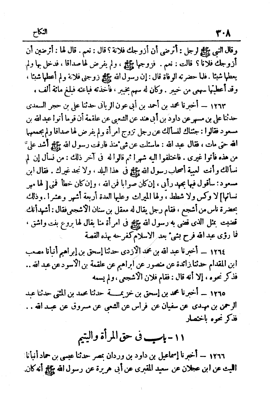 1263- أَخْبَرَنَا مُحَمَّدُ بْنُ أَحْمَدَ بْنِ أَبِي عَوْنٍ الرياني حَدَّثَنَا عَلِيُّ بْنُ حُجْرٍ السَّعْدِيُّ حَدَّثَنَا عَلِيُّ بْنُ مُسْهِرٍ عَنْ دَاوُدَ بْنِ أَبِي هِنْدٍ عَنِ الشَّعْبِيِّ عَنْ عَلْقَمَةَ أَنَّ قَوْمًا أَتَوْا عَبْدَ اللَّهِ بْنَ مَسْعُودٍ فَقَالُوا جئْنَاك لنسألك عَن رجل تزوج امْرَأَة وَلم يفْرض لَهَا صَدَاقًا وَلَمْ يَجْمَعْهُمَا اللَّهُ حَتَّى مَاتَ فَقَالَ عَبْدُ اللَّهِ مَا سُئِلْتُ عَنْ شَيْءٍ مُنْذُ فَارَقْتُ رَسُولَ اللَّهِ صَلَّى اللهُ عَلَيْهِ وَسَلَّمَ أَشَدَّ عَلَيَّ مِنْ هَذِهِ فَأْتُوا غَيْرِي فَاخْتَلَفُوا إِلَيْهِ شَهْرًا ثُمَّ قَالُوا لَهُ فِي آخِرِ ذَلِكَ مَنْ نَسْأَلُ إِنْ لَمْ نَسْأَلْكَ وَأَنْتَ لعيبة أَصْحَاب رَسُول الله صَلَّى اللهُ عَلَيْهِ وَسَلَّمَ فِي هَذَا الْبَلَد وَلا نَجْدُ غَيْرَكَ فَقَالَ ابْنُ مَسْعُودٍ سَأَقُولُ فِيهَا بِجَهْدِ رَأْيِي إِنْ كَانَ صَوَابًا فَمِنَ الله وَإِن كَانَ خطأ فمني لَهَا مهر نسائها لَا وَكْسَ وَلا شَطَطَ وَلَهَا الْمِيرَاثُ وَعَلَيْهَا الْعِدَّةُ أَرْبَعَةَ أَشْهُرٍ وَعَشْرًا وَذَلِكَ بِحَضْرَةِ نَاسٍ مِنْ أَشْجَعَ فَقَامَ رَجُلٌ يُقَالُ لَهُ مَعْقِلُ بْنُ سِنَانٍ الأَشْجَعِيُّ فَقَالَ أَشْهَدُ أَنَّكَ قَضَيْتَ بِمِثْلِ الَّذِي قَضَى بِهِ رَسُولُ اللَّهِ صَلَّى اللهُ عَلَيْهِ وَسَلَّمَ فِي امْرَأَةٍ مِنَّا يُقَالُ لَهَا بروع بنت واشق فَمَا رُؤِيَ عَبْدُ اللَّهِ فَرِحَ بِشَيْءٍ بَعْدَ الإِسْلامِ كَفَرْحِهِ بِهَذِهِ الْقِصَّة.