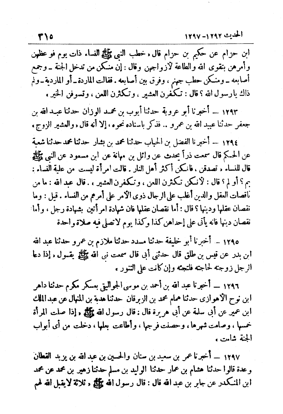1294- أَخْبَرَنَا الْفَضْلُ بْنُ الْحُبَابِ حَدَّثَنَا مُحَمَّدُ بْنُ بشار حَدثنَا مُحَمَّد حَدثنَا شُعْبَةَ عَنِ الْحَكَمِ قَالَ سَمِعْتُ ذَرًّا يُحَدِّثُ عَنْ وَائِلِ بْنِ مُهَانَةَ عَنِ ابْنِ مَسْعُودٍ عَنِ النَّبِيِّ صَلَّى اللهُ عَلَيْهِ وَسَلَّمَ قَالَ لِلنِّسَاءِ: "تَصَدَّقْنَ فَإِنَّكُنَّ أَكْثَرُ أَهْلِ النَّارِ" قَالَتِ امْرَأَةٌ لَيْسَتْ مِنْ عِلِيَةِ النِّسَاءِ بِمَ أَوْ لم قَالَ: "لأنكن تُكْثِرْنَ اللَّعْنَ وَتَكْفُرْنَ الْعَشِيرَ" قَالَ عَبْدُ اللَّهِ مَا مِنْ نَاقِصَاتِ الْعَقْلِ وَالدَّيْنِ أَغْلَبُ عَلَى الرِّجَالِ ذَوِي الأَمْرِ عَلَى أَمْرِهِمْ مِنَ النِّسَاءِ قِيلَ وَمَا نُقْصَانُ عَقْلِهَا وَدِينِهَا قَالَ أَمَّا نُقْصَانُ عَقْلِهَا فَإِنَّ شَهَادَةَ امْرَأَتَيْنِ بِشَهَادَةِ رَجُلٍ وَأَمَّا نُقْصَانُ دِينِهَا فَإِنَّهُ يَأْتِي عَلَى إِحْدَاهِنَّ كَذَا وَكَذَا يَوْم لَا تصلي فِيهِ صَلَاة وَاحِدَة.