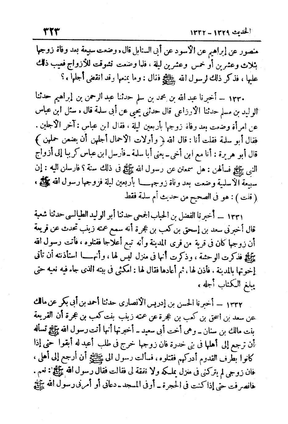 1330- أَخْبَرَنَا عَبْدُ اللَّهِ بْنُ مُحَمَّدِ بْنِ سَلْمٍ حَدثنَا عبد الرَّحْمَن بن إِبْرَاهِيم حَدثنَا الْوَلِيد بن مُسلم حَدَّثَنَا الأَوْزَاعِيُّ قَالَ حَدَّثَنِي يَحْيَى عَنْ أَبِي سَلَمَةَ قَالَ سُئِلَ ابْنُ عَبَّاسٍ عَنِ امْرَأَةٍ وَضَعَتْ بَعْدَ وَفَاةِ زَوْجِهَا بِأَرْبَعِينَ لَيْلَةً فَقَالَ ابْن عَبَّاس آخر الْأَجَليْنِ فَقَالَ أَبُو سَلمَة فَقلت أَنا قَالَ اللَّهُ: {وَأُولاتُ الْأَحْمَالِ أَجَلُهُنَّ أَنْ يَضَعْنَ حَمْلَهُنَّ} قَالَ أَبُو هُرَيْرَةَ أَنَا مَعَ ابْنِ أَخِي يَعْنِي أَبَا سَلَمَةَ فَأَرْسَلَ ابْنُ عَبَّاسٍ كُرَيْبًا إِِلَى أَزْوَاجِ النَّبِيِّ صَلَّى اللهُ عَلَيْهِ وَسَلَّمَ فسألهن هَل سمعتن عَنْ رَسُولِ اللَّهِ صَلَّى اللهُ عَلَيْهِ وَسَلَّمَ فِي ذَلِكَ سُنَّةً فَأَرْسَلْنَ إِِلَيْهِ أَنَّ سُبَيْعَةَ الأَسْلَمِيَّةَ وَضَعَتْ بَعْدَ وَفَاةِ زَوْجِهَا بِأَرْبَعِينَ لَيْلَةً فَزَوَّجَهَا رَسُولُ اللَّهِ صَلَّى اللهُ عَلَيْهِ وَسَلَّمَ قُلْتُ هُوَ فِي الصَّحِيح من حَدِيث أم سَلمَة فَقَط.