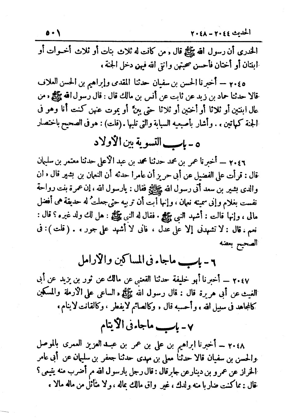 2045- أخبرنَا الْحسن بن سُفْيَان حَدَّثَنَا الْمُقَدَّمِيُّ وَإِبْرَاهِيمُ بْنُ الْحَسَنِ الْعَلافُ قَالا حَدَّثَنَا حَمَّادُ بْنُ زَيْدٍ عَنْ ثَابِتٍ عَنْ أَنَسِ بْنِ مَالِكٍ قَالَ قَالَ رَسُولُ اللَّهِ صَلَّى اللهُ عَلَيْهِ وَسَلَّمَ: "مَنْ عَالَ ابْنَتَيْنِ أَوْ ثَلاثَا أَوْ أُخْتَيْنِ أَوْ ثَلاثًا حَتَّى يَبِنَّ أَوْ يَمُوتَ عَنْهُنَّ كُنْتُ أَنَا وَهُوَ فِي الْجنَّة كهاتين" وَأَشَارَ بِأُصْبُعَيْهِ السبابَة وَالَّتِي تَلِيهَا قلت هُوَ فِي الصَّحِيح بِاخْتِصَار.