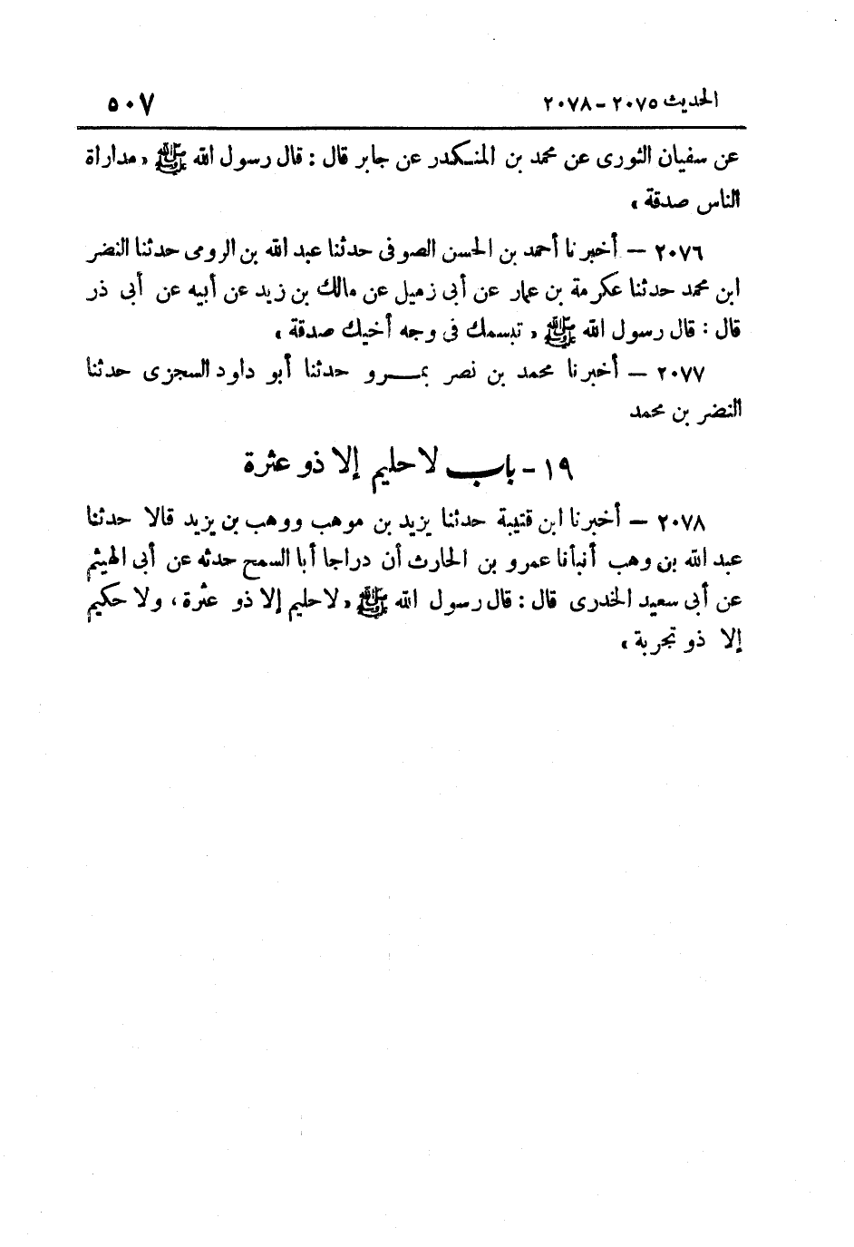 عَنْ سُفْيَانَ الثَّوْرِيِّ عَنْ مُحَمَّدِ بْنِ الْمُنْكَدِرِ عَنْ جَابِرٍ قَالَ قَالَ رَسُولُ اللَّهِ صَلَّى اللهُ عَلَيْهِ وَسَلَّمَ: "مداراة النَّاس صَدَقَة".