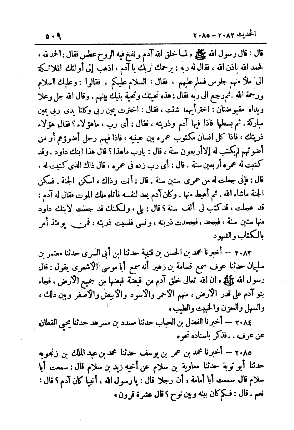 2085- أَخْبَرَنَا مُحَمَّدُ بْنُ عُمَرَ بْنِ يُوسُفَ حَدَّثَنَا مُحَمَّدُ بْنُ عَبْدِ الْمَلِكِ بْنِ زَنْجُوَيْهِ حَدَّثَنَا أَبُو تَوْبَةَ حَدَّثَنَا مُعَاوِيَةُ بْنُ سَلامٍ عَنْ أَخِيهِ زَيْدِ بْنِ سَلامٍ قَالَ سَمِعْتُ أَبَا سَلامٍ قَالَ سَمِعْتُ أَبَا أُمَامَةَ أَنَّ رَجُلًَا قَالَ يَا رَسُول الله أَنَبِيًّا كَانَ آدم قَالَ: "نعم" قَالَ فَكَمْ كَانَ بَيْنَهُ وَبَيْنَ نُوحٍ قَالَ: "عشرَة قُرُون".