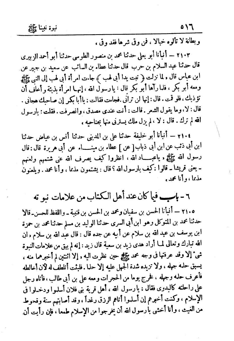 2105- أَنبأَنَا الْحَسَنُ بْنُ سُفْيَانَ وَمُحَمَّدُ بْنُ الْحَسَنِ بْنِ قُتَيْبَةَ وَاللَّفْظُ لِلْحَسَنِ قَالا حَدَّثَنَا مُحَمَّدُ بْنُ المتَوَكل وَهُوَ ابْن أبي السرى حَدثنَا الْوَلِيد بن مُسلم حَدَّثَنَا مُحَمَّدُ بْنُ حَمْزَةَ بْنِ يُوسُفَ بْنِ عَبْدِ اللَّهِ بْنِ سَلامٍ عَنْ أَبِيهِ عَنْ جَدِّهِ قَالَ قَالَ عَبْدُ اللَّهِ بْنُ سَلامٍ إِنَّ اللَّهَ تَبَارَكَ وَتَعَالَى لَمَّا أَرَادَ هُدَى زيد بن سعية قَالَ زيد إِنَّهُ لَمْ يَبْقَ مِنْ عَلامَاتَ النُّبُوَّةِ شَيْءٌ إِلا وَقَدْ عَرَفْتُهَا فِي وَجْهِ مُحَمَّدٍ صَلَّى اللهُ عَلَيْهِ وَسَلَّمَ حِينَ نَظَرْتُ إِلَيْهِ إِلا اثْنَتَيْنِ لَمْ أَخْبُرْهُمَا مِنْهُ يَسْبِقُ حِلْمُهُ جَهْلَهُ وَلَا تزيده شدَّة الْجَهْل عَلَيْهِ إِلَّا حلما فَلَبثت أَتَلَطَّفُ لَهُ لأَنْ أُخَالِطَهُ فَأَعْرِفَ حِلْمَهُ وَجَهْلَهُ فَخرج يَوْمًا مِنَ الْحُجُرَاتِ وَمَعَهُ عَلِيُّ بْنُ أَبِي طَالِبٍ فَأَتَاهُ رَجُلٌ عَلَى رَاحِلَتِهِ كَالْبَدَوِيِّ فَقَالَ يَا رَسُول الله أهل قَرْيَة بني فلَان أَسْلمُوا ودخلوا فِي الْإِسْلَام وَكنت أخْبرهُم إِن أَسْلمُوا أَتَاهُم الرزق رغدا وَقد أَصَابَتْهُم سنة وقحوط مِنَ الْغَيْثِ وَأَنَا أَخْشَى يَا رَسُولَ اللَّهِ أَن يخرجُوا من الْإِسْلَام طَمَعا فَإِن رَأَيْت أَن