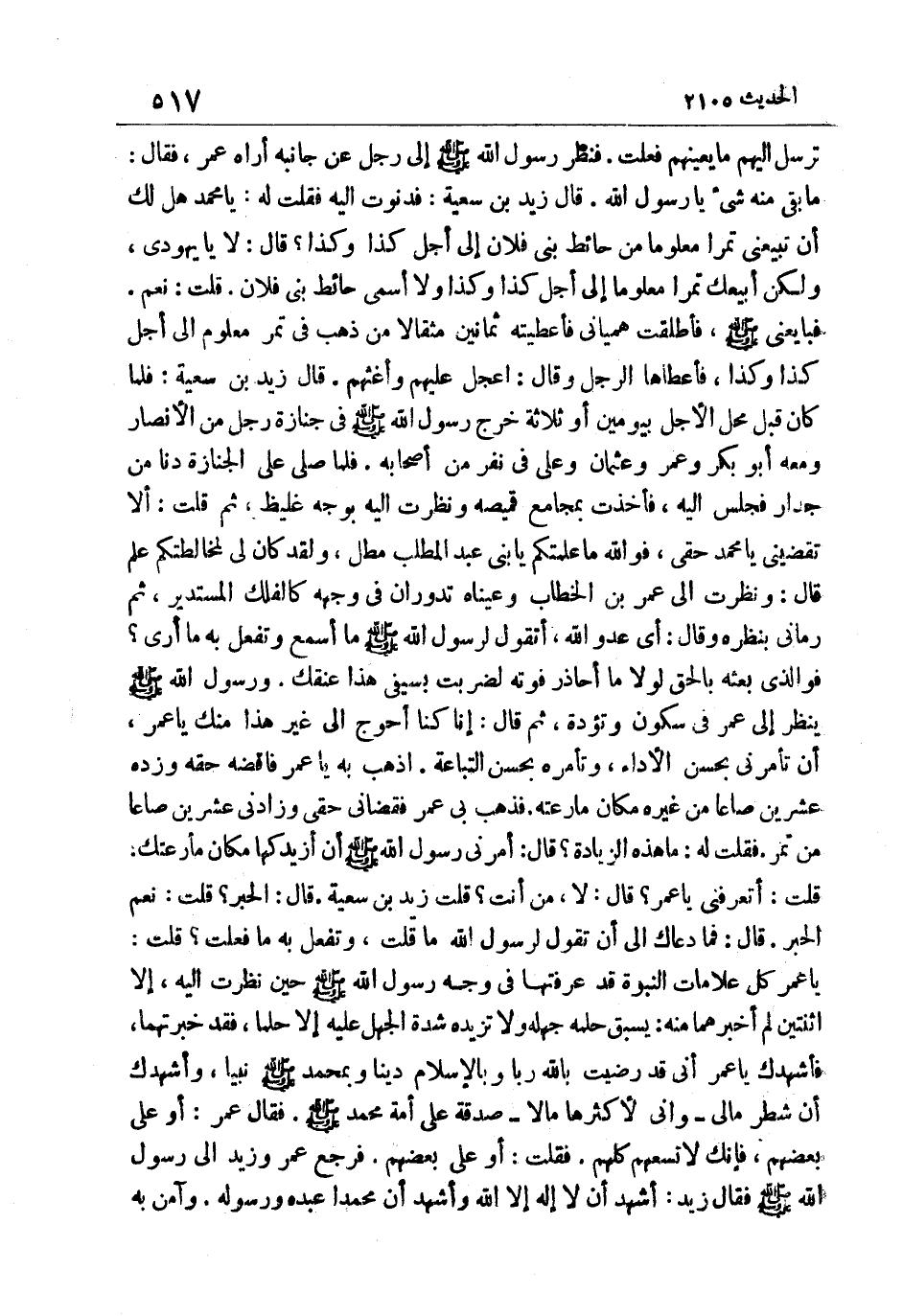 ترسل إِلَيْهِم مَا يعينهم فعلت فَنَظَرَ رَسُولُ اللَّهِ صَلَّى اللهُ عَلَيْهِ وَسَلَّمَ إِلَى رجل عَن جَانِبَهُ أُرَاهُ عُمَرُ فَقَالَ مَا بَقِيَ مِنْهُ شَيْءٌ يَا رَسُولَ اللَّهِ قَالَ زَيْدُ بْنُ سعية فَدَنَوْتُ إِلَيْهِ فَقُلْتُ لَهُ يَا مُحَمَّدُ هَلْ لَكَ أَنْ تَبِيعَنِي تَمْرًا مَعْلُومًا مِنْ حَائِطِ بني فلَان إِلَى أجل كَذَا وَكَذَا قَالَ: "لَا يَا يَهُودِيُّ وَلَكِنْ أَبِيعُكَ تَمْرًا مَعْلُومًا إِلَى أَجْلِ كَذَا وَكَذَا وَلا أُسَمِّي حَائِطَ بَنِي فُلانٍ" قُلْتُ نَعَمْ فَبَايَعَنِي صَلَّى اللهُ عَلَيْهِ وَسَلَّمَ فَأَطْلَقْتُ هُمْيَانِي فَأَعْطَيْتُهُ ثَمَانِينَ مِثْقَالا مِنْ ذَهَبٍ فِي تَمْرٍ مَعْلُومٍ إِلَى أَجْلِ كَذَا وَكَذَا فَأَعْطَاهَا الرجل وَقَالَ اعجل عَلَيْهِم وأغثهم قَالَ زيد بن سعية فَلَمَّا كَانَ قَبْلُ مَحَلِّ الأَجَلِ بِيَوْمَيْنِ أَوْ ثَلاثَةٍ خَرَجَ رَسُولُ اللَّهِ صَلَّى اللهُ عَلَيْهِ وَسَلَّمَ فِي جَنَازَةِ رَجُلٍ مِنَ الأَنْصَارِ وَمَعَهُ أَبُو بكر وَعمر وَعُثْمَان وَعلي فِي نفر مِنْ أَصْحَابِهِ فَلَمَّا صَلَّى عَلَى الْجَنَازَةِ دَنَا مِنْ جِدَارٍ فَجَلَسَ إِلَيْهِ فَأَخَذْتُ بِمَجَامِعِ قَمِيصِهِ وَنَظَرْتُ إِلَيْهِ بِوَجْهٍ غَلِيظٍ ثُمَّ قُلْتُ أَلا تَقْضِينِي يَا مُحَمَّدُ حَقِّي فَوَاللَّهِ مَا عَلِمْتُكُمْ يَا بني عبد الْمطلب مطل وَلَقَد كَانَ لي لمخالطتكم عِلْمٌ قَالَ وَنَظَرْتُ إِلَى عُمَرَ بْنِ الْخَطَّابِ وَعَيْنَاهُ تَدُورَانِ فِي وَجْهِهِ كَالْفَلَكِ الْمُسْتَدِيرِ ثُمَّ رماني بنظره وَقَالَ: أَيْ عَدُوَّ اللَّهِ أَتَقُولُ لِرَسُولِ اللَّهِ صَلَّى اللهُ عَلَيْهِ وَسَلَّمَ مَا أَسْمَعُ وَتَفْعَلُ بِهِ مَا أَرَى فَوَالَّذِي بَعَثَهُ بِالْحَقِّ لَوْلا مَا أُحَاِذْرُ فَوْتَهُ لَضَرَبْتُ بِسَيْفِي هَذَا عُنُقَكَ وَرَسُولُ اللَّهِ صَلَّى اللهُ عَلَيْهِ وَسَلَّمَ يَنْظُرُ إِلَى عُمَرَ فِي سُكُونٍ وَتُؤَدَةٍ ثُمَّ قَالَ: "إِنَّا كُنَّا أَحْوَجَ إِلَى غَيْرِ هَذَا مِنْكَ يَا عُمَرُ أَنْ تَأْمُرَنِي بِحُسْنِ الأَدَاءِ وَتَأْمُرَهُ بِحُسْنِ التِّبَاعَةِ اذْهَبْ بِهِ يَا عُمَرُ فَاقْضِهِ حَقَّهُ وَزِدْهُ عِشْرِينَ صَاعًا مِنْ غَيْرِهِ مَكَانَ مارعته" فَذَهَبَ بِي عُمَرُ فَقَضَانِي حَقِّي وَزَادَنِي عِشْرِينَ صَاعا من تمر فَقلت لَهُ مَا هَذِهِ الزِّيَادَةُ قَالَ أَمَرَنِي رَسُولُ اللَّهِ صَلَّى اللهُ عَلَيْهِ وَسَلَّمَ إِن أزيدكها مَكَان مَا رعتك قلت أتعرفني يَا عمر قَالَ لَا من أَنْت قلت زيد بن سعية قَالَ الْحَبْرُ قُلْتُ نَعَمْ الْحَبْرُ قَالَ فَمَا دعَاك إِلَى أَنْ تَقُولَ لِرَسُولِ اللَّهِ صَلَّى اللهُ عَلَيْهِ وَسَلَّمَ مَا قُلْتَ وَتَفْعَلُ بِهِ مَا فَعَلْتَ قلت يَا عُمَرُ كُلُّ عَلامَاتَ النُّبُوَّةِ قَدْ عَرَفْتُهَا فِي وَجْهِ رَسُولِ اللَّهِ صَلَّى اللهُ عَلَيْهِ وَسَلَّمَ حِينَ نَظَرْتُ إِلَيْهِ إِلا اثْنَتَيْنِ لَمْ أخبرهما مِنْهُ يسْبق حلمه جَهله وَلَا تزيده شدَّة الْجَهْل عَلَيْهِ إِلَّا حلما فقد خبرتهما فأشهدك يَا عمر أَنِّي قد رضيب بِاللَّهِ رِبًا وَبِالإِسْلامِ دَيْنًا وَبِمُحَمَّدٍ صَلَّى اللهُ عَلَيْهِ وَسَلَّمَ نَبِيًّا وَأُشْهِدُكَ أَنَّ شَطْرَ مَالِي وَإِنِّي لأكثرها مَالا صَدَقَةٌ عَلَى أُمَّةِ مُحَمَّدٍ صَلَّى اللهُ عَلَيْهِ وَسَلَّمَ فَقَالَ عُمَرُ أَوْ عَلَى بَعْضِهِمْ فَإنَّك لَا تسعهم كلهم فَقلت أَوْ عَلَى بَعْضِهِمْ فَرَجَعَ عُمَرُ وَزَيْدٌ إِلَى رَسُول الله صَلَّى اللهُ عَلَيْهِ وَسَلَّمَ فَقَالَ زَيْدٌ أَشْهَدُ أَنْ لَا إِلَهَ إِلا اللَّهُ وَأَشْهَدُ أَن مُحَمَّدًا عَبده وَرَسُوله وآمن بِهِ