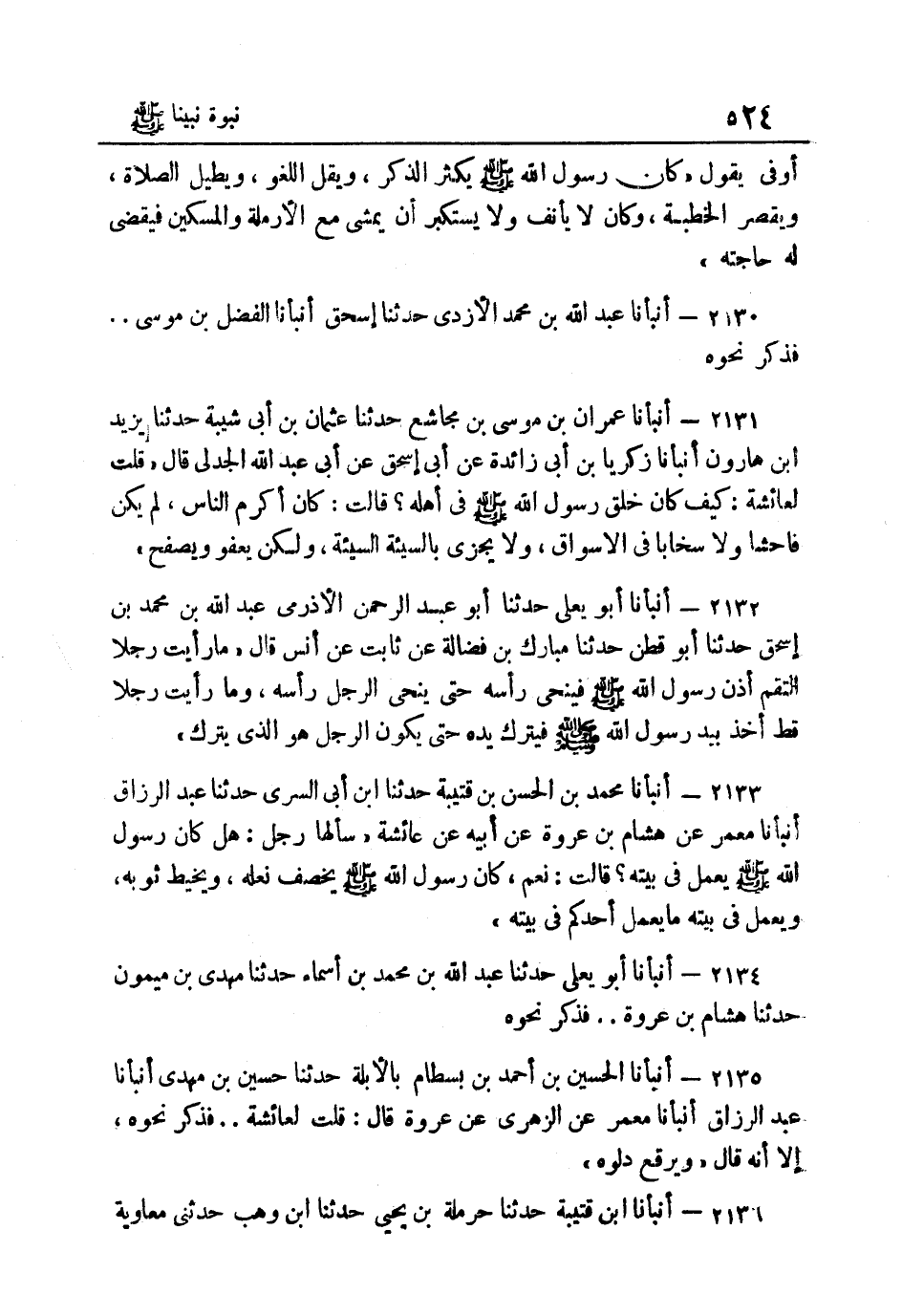 2131- أَنبأَنَا عِمْرَانُ بْنُ مُوسَى بْنِ مُجَاشِعٍ حَدَّثَنَا عُثْمَانُ بْنُ أَبِي شَيْبَةَ حَدَّثَنَا يَزِيدُ بْنُ هَارُونَ أَنبأَنَا زَكَرِيَّا بْنِ أَبِي زَائِدَةَ عَنْ أَبِي إِِسْحَاقَ عَنْ أَبِي عَبْدِ اللَّهِ الْجَدَلِيِّ قَالَ قُلْتُ لِعَائِشَةَ كَيْفَ كَانَ خُلُقِ رَسُولِ اللَّهِ صَلَّى اللهُ عَلَيْهِ وَسَلَّمَ فِي أَهْلِهِ قَالَتْ كَانَ أكْرم النَّاس لم يكن فَاحِشا وَلا سَخَّابًا فِي الأَسْوَاقِ وَلا يَجْزِي بِالسَّيِّئَةِ السَّيئَة وَلَكِن يعْفُو ويصفح.