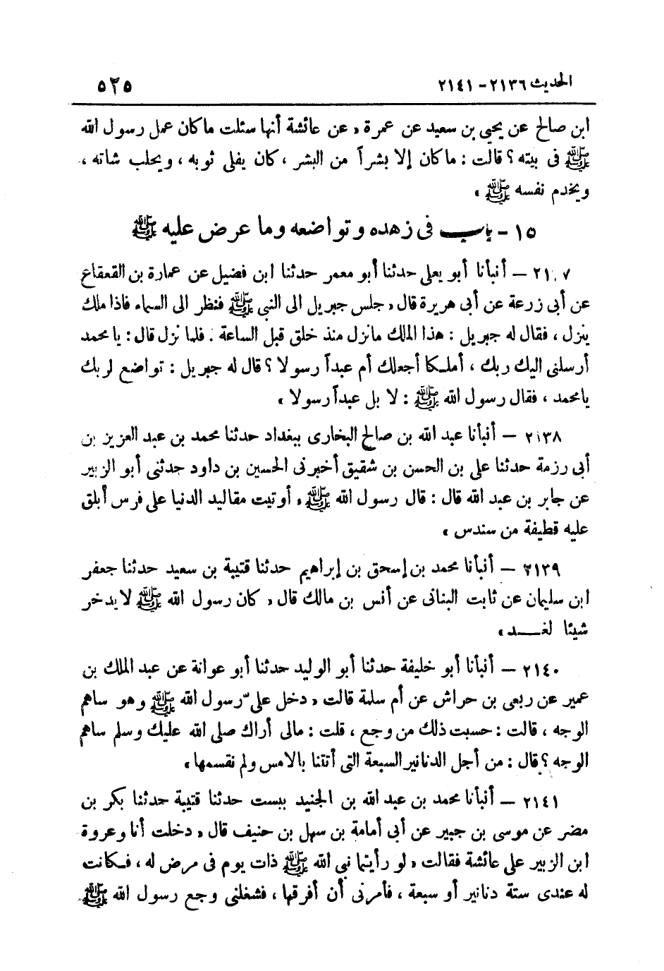 2137- أَنبأَنَا أَبُو يَعْلَى حَدَّثَنَا أَبُو مَعْمَرٍ حَدَّثَنَا ابْنُ فُضَيْلٍ عَنْ عُمَارَةَ بْنِ الْقَعْقَاعِ عَنْ أَبِي زُرْعَةَ عَنْ أَبِي هُرَيْرَةَ قَالَ جَلَسَ جِبْرِيلُ إِلَى النَّبِيِّ صَلَّى اللهُ عَلَيْهِ وَسَلَّمَ فَنَظَرَ إِِلَى السَّمَاءِ فَإِِذَا مَلَكٌ يَنْزِلُ فَقَالَ لَهُ جِبْرِيلُ هَذَا الْمَلَكُ مَا نَزَلَ مُنْذُ خُلِقَ قَبْلَ السَّاعَةِ فَلَمَّا نَزَلَ قَالَ يَا مُحَمَّدُ أَرْسلنِي إِلَيْك رَبك أملكا أجعلك أم عبدا رَسُولا قَالَ لَهُ جِبْرِيلُ تَوَاضَعْ لِرَبِّكَ يَا مُحَمَّدُ فَقَالَ رَسُولُ اللَّهِ صَلَّى اللهُ عَلَيْهِ وَسَلَّمَ: "لَا بل عبدا رَسُولا".