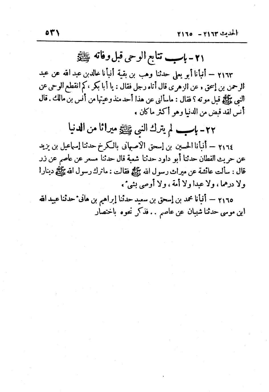 2164- أَنبأَنَا الْحُسَيْن بن إِسْحَاق الْأَصْبَهَانِيّ بالكرخ حَدثنَا إِسْمَاعِيل بن يزِيد عَن حُرَيْثٍ الْقَطَّانُ حَدَّثَنَا أَبُو دَاوُدَ حَدَّثَنَا شُعْبَةُ قَالَ حَدثنَا مسعر عَنْ عَاصِمٍ عَنْ زِرٍّ قَالَ سَأَلْتُ عَائِشَةَ عَنْ مِيرَاثِ رَسُولِ اللَّهِ صَلَّى اللهُ عَلَيْهِ وَسَلَّمَ فَقَالَتْ مَا تَرَكَ رَسُولُ اللَّهِ صَلَّى اللهُ عَلَيْهِ وَسَلَّمَ دِينَارًا وَلا دِرْهَمًا وَلا عَبْدًا وَلا أمة وَلَا أوصى بِشَيْء.