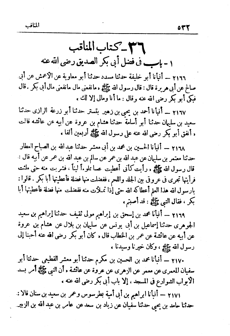 2170- أَنبأَنَا مُحَمَّدُ بْنُ الْحُسَيْنِ بْنِ مُكْرَمٍ حَدَّثَنَا أَبُو معشر الْقَطِيعِيُّ حَدَّثَنَا أَبُو سُفْيَانَ الْمَعْمَرِيُّ عَنْ مَعْمَرٌ عَنِ الزُّهْرِيِّ عَنْ عُرْوَةَ عَنْ عَائِشَةَ أَنّ النَّبِيَّ صَلَّى اللهُ عَلَيْهِ وَسَلَّمَ أَمَرَ بِسَدِّ الأَبْوَابِ الشَّوَارِعِ فِي الْمَسْجِدِ إِِلا بَابَ أَبِي بكر رَضِي الله عَنهُ.