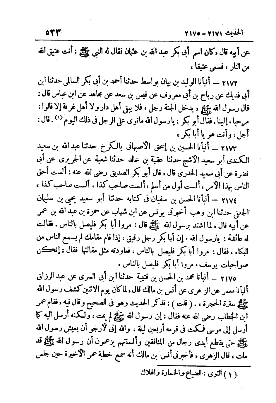 2172- أَنبأَنَا الْوَلِيد بن بَيَان بواسط حَدثنَا أَحْمد بْنِ أَبِي بَكْرٍ السَّالِمِيُّ حَدَّثَنَا ابْنُ أَبِي فُدَيْكٍ عَنْ رَبَاحِ بْنِ أَبِي مَعْرُوفٍ عَنْ قَيْسِ بْنِ سَعْدٍ عَنْ مُجَاهِدٍ عَنِ ابْنِ عَبَّاسٍ قَالَ قَالَ رَسُولُ اللَّهِ صَلَّى اللهُ عَلَيْهِ وَسَلَّمَ: "يَدْخُلُ الْجَنَّةَ رَجُلٌ فَلا يَبْقَى أَهْلُ دَارٍ وَلا أَهْلُ غُرْفَةٍ إِِلا قَالُوا مرْحَبًا إِِلَيْنَا" فَقَالَ أَبُو بَكْرٍ يَا رَسُولَ اللَّهِ مَا توى1 على الرَّجُلِ فِي ذَلِكَ الْيَوْمِ قَالَ: "أَجَلْ وَأَنْتَ هُوَ يَا أَبَا بكر".