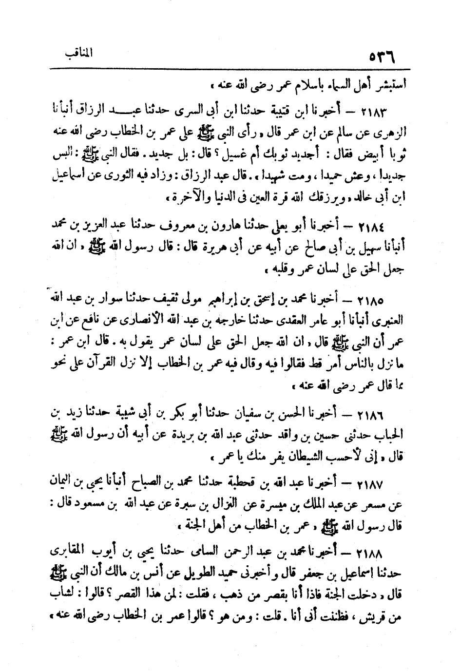 2188- أَخْبَرَنَا مُحَمَّدُ بْنُ عَبْدِ الرَّحْمَنِ السَّامِيُّ حَدَّثَنَا يَحْيَى بْنُ أَيُّوبَ الْمَقَابِرِيُّ حَدَّثَنَا إِسْمَاعِيلُ بْنُ جَعْفَرٍ قَالَ وَأَخْبَرَنِي حُمَيْدٌ الطَّوِيلُ عَنْ أَنَسِ بْنِ مَالِكٍ أَنّ النَّبِيَّ صَلَّى اللهُ عَلَيْهِ وَسَلَّمَ قَالَ: "دَخَلْتُ الْجَنَّةَ فَإِِذَا أَنَا بِقَصْرٍ مِنْ ذَهَبٍ فَقُلْتُ لِمَنْ هَذَا الْقَصْرُ قَالُوا لشاب من قُرَيْش فَظَنَنْت أَنِّي أَنا قلت وَمن هُوَ قَالُوا عمر بن الْخطاب رَضِي الله عَنهُ".
