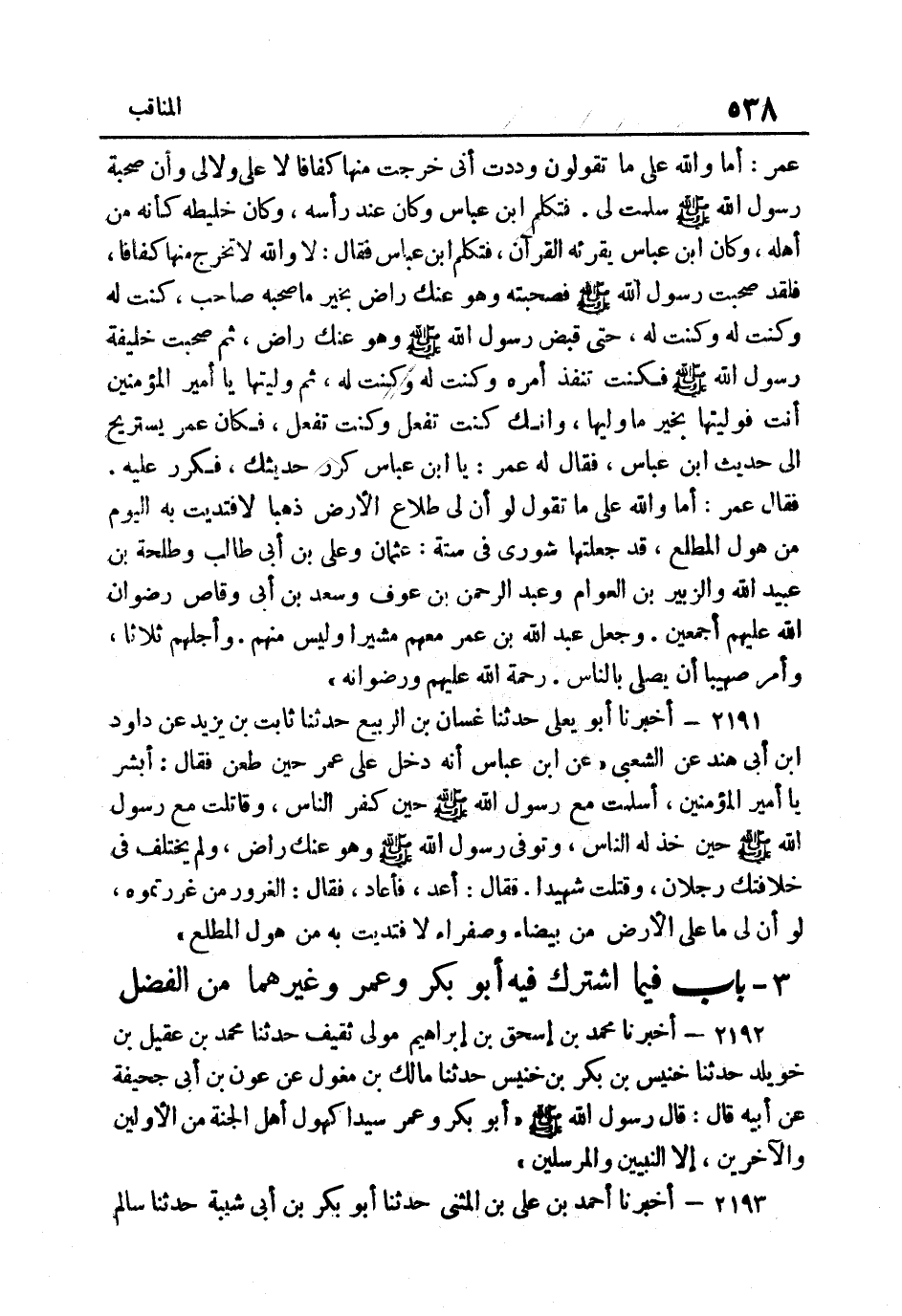2192- أخبرنَا مُحَمَّد بن إِسْحَاق بن إِبْرَاهِيم مولى ثَقِيفٍ حَدَّثَنَا مُحَمَّدُ بْنُ عُقَيْلِ بْنِ خُوَيْلِدٍ حَدَّثَنَا خُنَيْسُ بْنُ بَكْرِ بْنِ خُنَيْسٍ حَدَّثَنَا مَالِكُ بْنُ مِغْوَلٍ عَنْ عَوْنِ بْنِ أَبِي جُحَيْفَةَ عَنْ أَبِيهِ قَالَ قَالَ رَسُولُ اللَّهِ صَلَّى اللهُ عَلَيْهِ وَسَلَّمَ: "أَبُو بكر وَعمر سَيِّدَا كُهُولِ أَهْلِ الْجَنَّةِ مِنَ الأَوَّلِينَ وَالآخِرِينَ إِلَّا النَّبِيين وَالْمُرْسلِينَ".