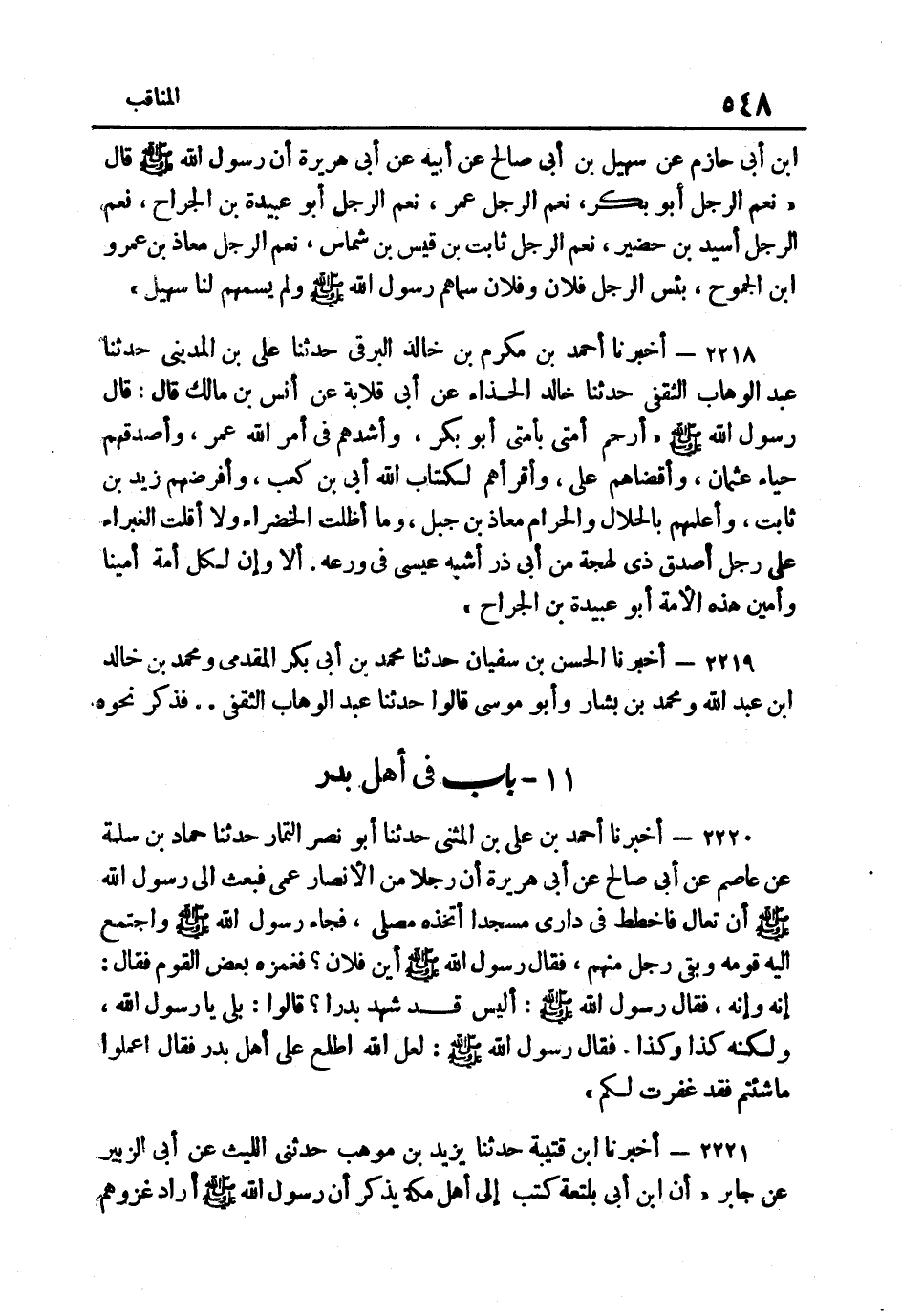 2219- أَخْبَرَنَا الْحَسَنُ بْنُ سُفْيَانَ حَدَّثَنَا مُحَمَّدُ بْنُ أَبِي بَكْرٍ الْمُقَدَّمِيُّ وَمُحَمَّدُ بْنُ خَالِدِ بْنِ عَبْدِ اللَّهِ وَمُحَمَّدُ بْنُ بَشَّارٍ وَأَبُو مُوسَى قَالُوا حَدثنَا عبد الْوَهَّاب الثَّقَفِيّ.. فَذكر نَحوه.