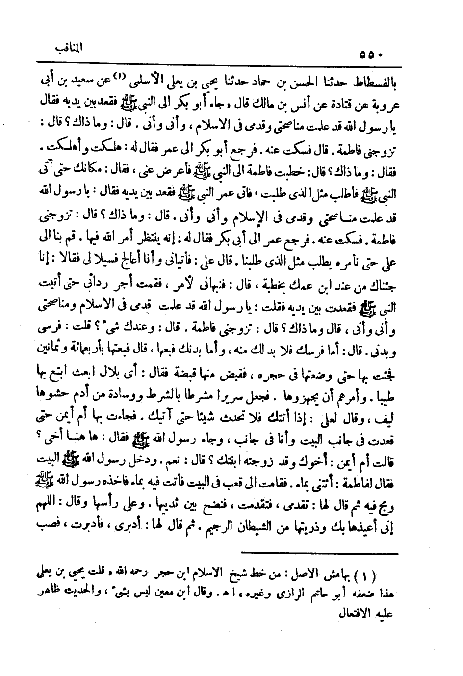 بِالْفُسْطَاطِ حَدَّثَنَا الْحَسَنُ بْنُ حَمَّادٍ حَدَّثَنَا يَحْيَى بْنُ يَعْلَى الأَسْلَمِيُّ1 عَنْ سَعِيدِ بْنِ أَبِي عَرُوبَةَ عَنْ قَتَادَةَ عَنْ أَنَسِ بْنِ مَالِكٍ قَالَ جَاءَ أَبُو بَكْرٍ إِِلَى النَّبِيِّ صَلَّى اللهُ عَلَيْهِ وَسَلَّمَ فَقَعَدَ بَيْنَ يَدَيْهِ فَقَالَ يَا رَسُولَ اللَّهِ قَدْ عَلِمْتَ مُنَاصَحَتِي وَقِدَمِي فِي الإِِسْلامِ وَإِِنِّي وَإِِنِّي قَالَ: "وَمَا ذَاكَ" قَالَ: تُزَوِّجُنِي فَاطِمَةَ قَالَ فَسَكَتَ عَنْهُ فَرَجَعَ أَبُو بكر إِلَى عمر فَقَالَ لَهُ هَلَكت وأهلكت فَقَالَ وَمَا ذَاكَ قَالَ خَطَبْتُ فَاطِمَةَ إِِلَى النَّبِيِّ صَلَّى اللهُ عَلَيْهِ وَسَلَّمَ فَأَعْرض عني فَقَالَ مَكَانَكَ حَتَّى آتِيَ النَّبِيَّ صَلَّى اللهُ عَلَيْهِ وَسَلَّمَ فَأَطْلُبُ مِثْلَ الَّذِي طَلَبْتَ فَأَتَى عُمَرُ النَّبِي صَلَّى اللهُ عَلَيْهِ وَسَلَّمَ فَقعدَ بَين يَدَيْهِ فَقَالَ يَا رَسُولَ اللَّهِ قَدْ عَلِمْتَ مُنَاصَحَتِي وَقِدَمِي فِي الإِِسْلامِ وَإِِنِّي وَإِِنِّي قَالَ: "وَمَا ذَاكَ" قَالَ تُزَوِّجُنِي فَاطِمَةَ فَسَكَتَ عَنْهُ فَرجع عمر إِِلَى أَبِي بَكْرٍ فَقَالَ لَهُ إِِنَّهُ يَنْتَظِرُ أَمْرَ اللَّهِ فِيهَا قُمْ بِنَا إِِلَى عَلِيٍّ حَتَّى نَأْمُرَهُ يَطْلُبُ مِثْلَ الَّذِي طَلَبْنَا قَالَ عَلِيٌّ فَأَتَيَانِي وَأَنَا أُعَالِجُ فَسِيلا لِي فَقَالا إِِنَّا جِئْنَاكَ مِنْ عِنْدِ ابْنِ عَمِّكِ بِخِطْبَةٍ قَالَ فَنَبَّهَانِي لأَمْرٍ فَقُمْتُ أَجُرُّ رِدَائِي حَتَّى أَتَيْتُ النَّبِيَّ صَلَّى اللهُ عَلَيْهِ وَسَلَّمَ فَقَعَدْتُ بَيْنَ يَدَيْهِ فَقُلْتُ يَا رَسُولَ اللَّهِ قَدْ عَلِمْتَ قِدَمِي فِي الإِِسْلامِ وَمُنَاصَحَتِي وَإِِنِّي وَإِِنِّي قَالَ: "وَمَا ذَاك" قَالَ تُزَوِّجُنِي فَاطِمَةَ قَالَ: "وَعِنْدَكَ شَيْءٌ" قُلْتُ فَرَسِي وَبَدَنِي قَالَ: "أَمَّا فَرَسُكَ فَلا بُدَّ لَكَ مِنْهُ وَأما بدنك فبعها" قَالَ فبعتها بأربعمائة وَثَمَانِينَ فَجِئْتُ بِهَا حَتَّى وَضَعْتُهَا فِي حِجْرِهِ فَقبض مِنْهَا قَبْضَة فَقَالَ: "أَي بِلَال ابْعَثْ ابتع بهَا طيبا" وَأمرهمْ أَن يجهزوها فَجعل سَرِيرًا مُشْرَطًا بِالشَّرْطِ وَوِسَادَةً مِنْ أَدَمٍ حَشْوُهَا لِيفٌ وَقَالَ لِعَلِيٍّ: "إِِذَا أَتَتْكَ فَلا تُحْدِثْ شَيْئا حَتَّى آتِيك" فَجَاءَت بهَا أُمِّ أَيْمَنَ حَتَّى قَعَدَتْ فِي جَانِبِ الْبَيْتِ وَأَنَا فِي جَانِبٍ وَجَاءَ رَسُولُ اللَّهِ صَلَّى اللهُ عَلَيْهِ وَسَلَّمَ فَقَالَ: "هَا هُنَا أَخِي" قَالَتْ أُمُّ أَيْمَنَ أَخُوكَ وَقَدْ زَوَّجْتَهُ ابْنَتَكَ قَالَ نَعَمْ وَدَخَلَ رَسُولُ اللَّهِ صَلَّى اللهُ عَلَيْهِ وَسَلَّمَ الْبَيْتَ فَقَالَ لفاطمة: "ائْتِنِي بِمَاءٍ" فَقَامَتْ إِِلَى قَعْبٍ فِي الْبَيْتِ فَأَتَتْ فِيهِ بِمَاء فَأَخَذَهُ رَسُولُ اللَّهِ صَلَّى اللهُ عَلَيْهِ وَسَلَّمَ وَمَجَّ فِيهِ ثُمَّ قَالَ لَهَا: "تَقَدَّمِي" فَتَقَدَّمَتْ فَنَضَحَ بَيْنَ ثَدْيَيْهَا وَعَلَى رَأْسِهَا وَقَالَ: "اللَّهُمَّ إِِنِّي أُعِيذُهَا بِكَ وذريتها من الشَّيْطَان الرَّجِيم" ثمَّ قَالَ: "لَهَا أدبري" فأدبرت فصب