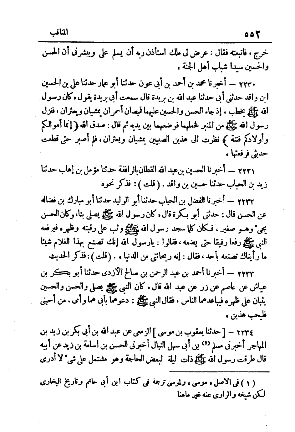2233- أخبرنَا أَحْمد بن عَبْدُ الرَّحْمَنِ بْنُ صَالِحٍ الأَزْدِيُّ حَدَّثَنَا أَبُو بَكْرِ بْنُ عَيَّاشٍ عَنْ عَاصِمٍ عَنْ زِرٍّ عَنْ عَبْدِ اللَّهِ قَالَ كَانَ النَّبِيُّ صَلَّى اللهُ عَلَيْهِ وَسَلَّمَ يُصَلِّي وَالْحَسَنُ وَالْحُسَيْنُ يَثِبَانِ على ظَهره فيباعدهما النَّاس فَقَالَ النَّبِي صَلَّى اللهُ عَلَيْهِ وَسَلَّمَ: "دَعُوهُمَا بِأَبِي هُمَا وَأمي من أَحبَّنِي فليحب هذَيْن".