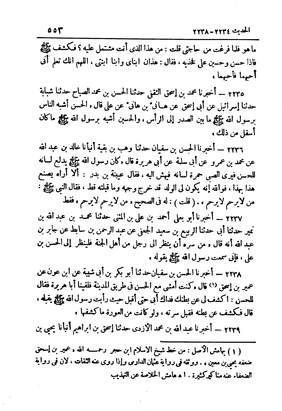 2235- أَخْبَرَنَا مُحَمَّدُ بْنُ إِِسْحَاقَ الثَّقَفِيُّ حَدَّثَنَا الْحَسَنُ بن مُحَمَّد الصَّبَّاحِ حَدَّثَنَا شَبَابَةُ حَدَّثَنَا إِِسْرَائِيلُ عَنْ أَبِي إِسْحَاق عَن هانىء بن هانىء عَنْ عَلِيٍّ قَالَ الْحَسَنُ أَشْبَهُ النَّاسِ بِرَسُولِ اللَّهِ صَلَّى اللهُ عَلَيْهِ وَسَلَّمَ مَا بَيْنَ الصَّدْر إِلَى الرَّأْس وَالْحُسَيْن أَشْبَهَ بِرَسُولِ اللَّهِ صَلَّى اللهُ عَلَيْهِ وَسَلَّمَ مَا كَانَ أَسْفَل من ذَلِك.