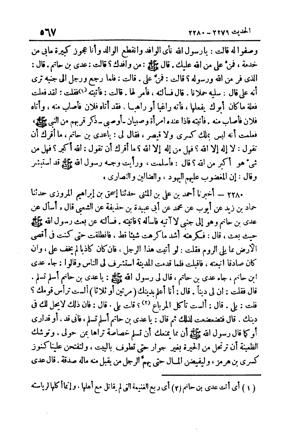 2280- أَخْبَرَنَا أَحْمَدُ بْنُ عَلِيِّ بْنِ الْمُثَنَّى حَدَّثَنَا إِسْحَاق بن إِبْرَاهِيم الْمروزِي حَدَّثَنَا حَمَّادُ بْنُ زَيْدٍ عَنْ أَيُّوبَ عَنْ مُحَمَّد بن أبي عُبَيْدَة بن حُذَيْفَة عَن الشّعبِيّ قَالَ أسأَل عَن عَدِيِّ بْنِ حَاتِمٍ وَهُوَ إِِلَى جَنْبِي لَا آتيه فأسأله فَأَتَيْته فَسَأَلته عَن بَعَثَ رَسُولُ اللَّهِ صَلَّى اللهُ عَلَيْهِ وَسَلَّمَ حَيْثُ بعث قَالَ فَكَرِهْتُهُ أَشَدَّ مَا كَرِهْتُ شَيْئًا قَطُّ فَانْطَلَقْتُ حَتَّى كُنْتُ فِي أَقْصَى الأَرْضِ مِمَّا يَلِيَ الرُّومَ فَقُلْتُ لَوْ أَتَيْتُ هَذَا الرَّجُلَ فَإِِنْ كَانَ كَاذِبًا لَمْ يَخْفَ عَلَيَّ وَإِِنْ كَانَ صَادِقًا اتَّبَعْتُهُ فَأَقْبَلْتُ فَلَمَّا قَدِمْتُ الْمَدِينَةَ اسْتَشْرَفَ لِي النَّاسُ وَقَالُوا جَاءَ عَدِيُّ بْنُ حَاتِمٍ جَاءَ عدي بن حَاتِم قَالَ لِي رَسُولُ اللَّهِ صَلَّى اللهُ عَلَيْهِ وَسَلَّمَ: "يَا عَدِيَّ بْنَ حَاتِمٍ أَسْلِمْ تَسْلَمْ" قَالَ فَقلت إِِنَّ لِي دِينًا قَالَ: "أَنَا أَعْلَمُ بِدِينِكَ" مرَّتَيْنِ أَو ثَلَاثًا "أَلَسْت ترأس قَوْمك" قلت بلَى قَالَ: "أَلَسْت تَأْكُل المرباع2" قُلْتُ بَلَى قَالَ: "فَإِِنَّ ذَلِكَ لَا يَحِلُّ لَكَ فِي دِينِكَ" قَالَ فَتَضَعْضَعْتُ لِذَلِكَ ثُمَّ قَالَ: "يَا عَدِيَّ بْنَ حَاتِمٍ أَسْلِمْ تَسْلَمْ" فَإِنِّي قد أَوْ قَدْ أَرَى أَوْ كَمَا قَالَ رَسُولُ اللَّهِ صَلَّى اللهُ عَلَيْهِ وَسَلَّمَ: "إِن مِمَّا يمنعك أَن تسلم خصَاصَة ترَاهَا بِمن حَولي وتوشك الظعينة أَن ترتحل مِنَ الْحِيرَةِ بِغَيْرِ جِوَارٍ حَتَّى تَطُوفَ بِالْبَيْتِ وَلَتُفْتَحَنَّ عَلَيْنَا كُنُوزُ كِسْرَى بْنِ هُرْمُزَ وَلَيَفِيضَنَّ المَال حَتَّى يُهِمَّ الرَّجُلَ مَنْ يَقْبَلُ مِنْهُ مَالَهُ صَدَقَة" قَالَ عدي