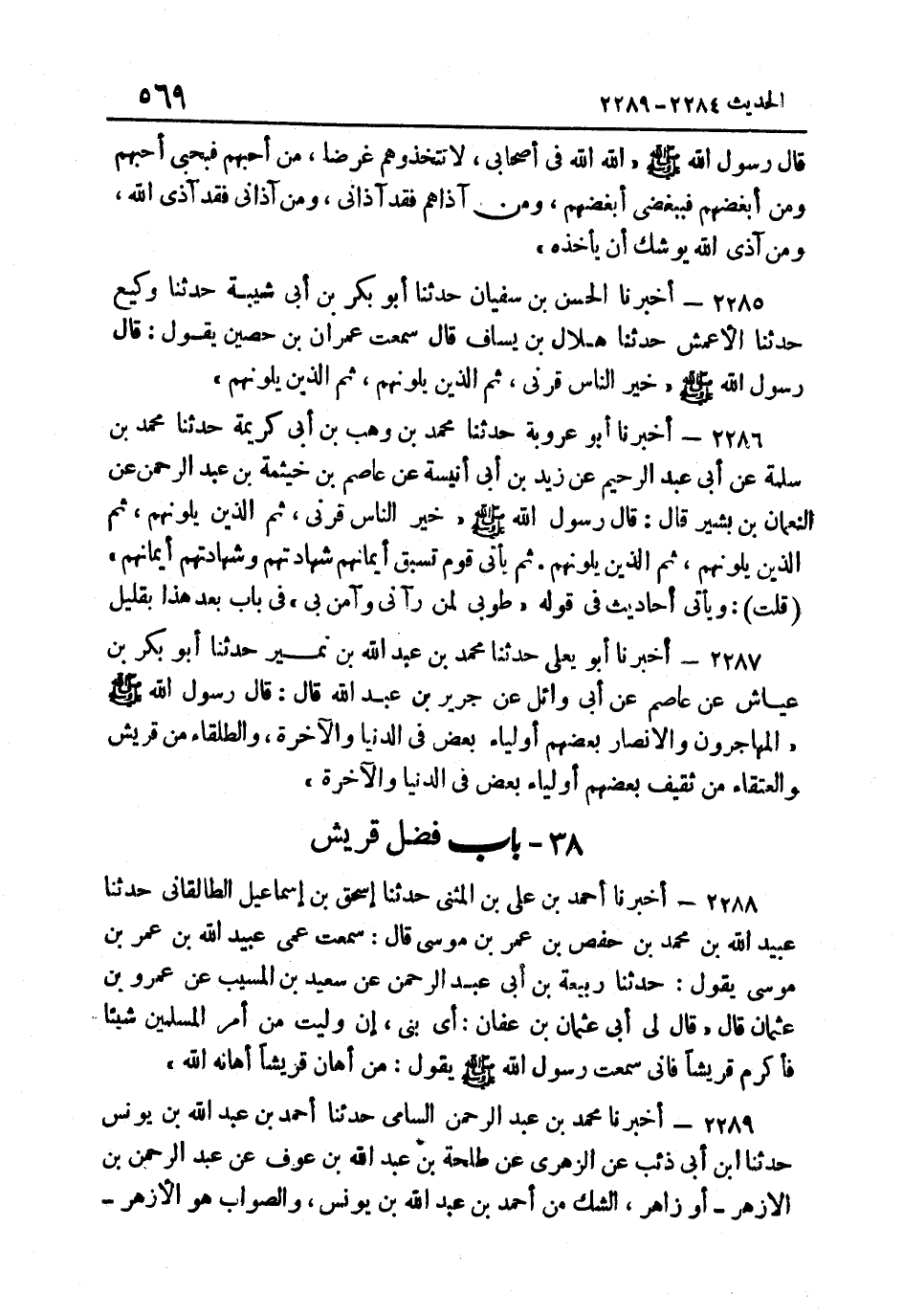2288- أَخْبَرَنَا أَحْمَدُ بْنُ عَلِيِّ بْنِ الْمُثَنَّى حَدَّثَنَا إِسْحَاق بن إِسْمَاعِيل الطَّالقَانِي حَدَّثَنَا عُبَيْدُ اللَّهِ بْنُ مُحَمَّدِ بْنِ حَفْصٍ بْنِ عُمَرَ بْنِ مُوسَى قَالَ سَمِعْتُ عَمِّيَ عُبَيْدَ اللَّهِ بْنَ عُمَرَ بْنِ مُوسَى يَقُولُ حَدَّثَنَا رَبِيعَةُ بْنُ أَبِي عَبْدِ الرَّحْمَنِ عَنْ سَعِيدِ بْنِ الْمُسَيَّبِ عَنْ عَمْرِو بْنِ عُثْمَانَ قَالَ قَالَ لِي أَبِي عُثْمَانُ بْنُ عَفَّانَ أَي بني إِن وليت من أَمر الْمُسلمين شَيْئا فَأكْرم قُريْشًا فَإِنِّي سَمِعت رَسُول الله صَلَّى اللهُ عَلَيْهِ وَسَلَّمَ يَقُولُ: "مَنْ أَهَانَ قُرَيْشًا أَهَانَهُ اللَّهُ".