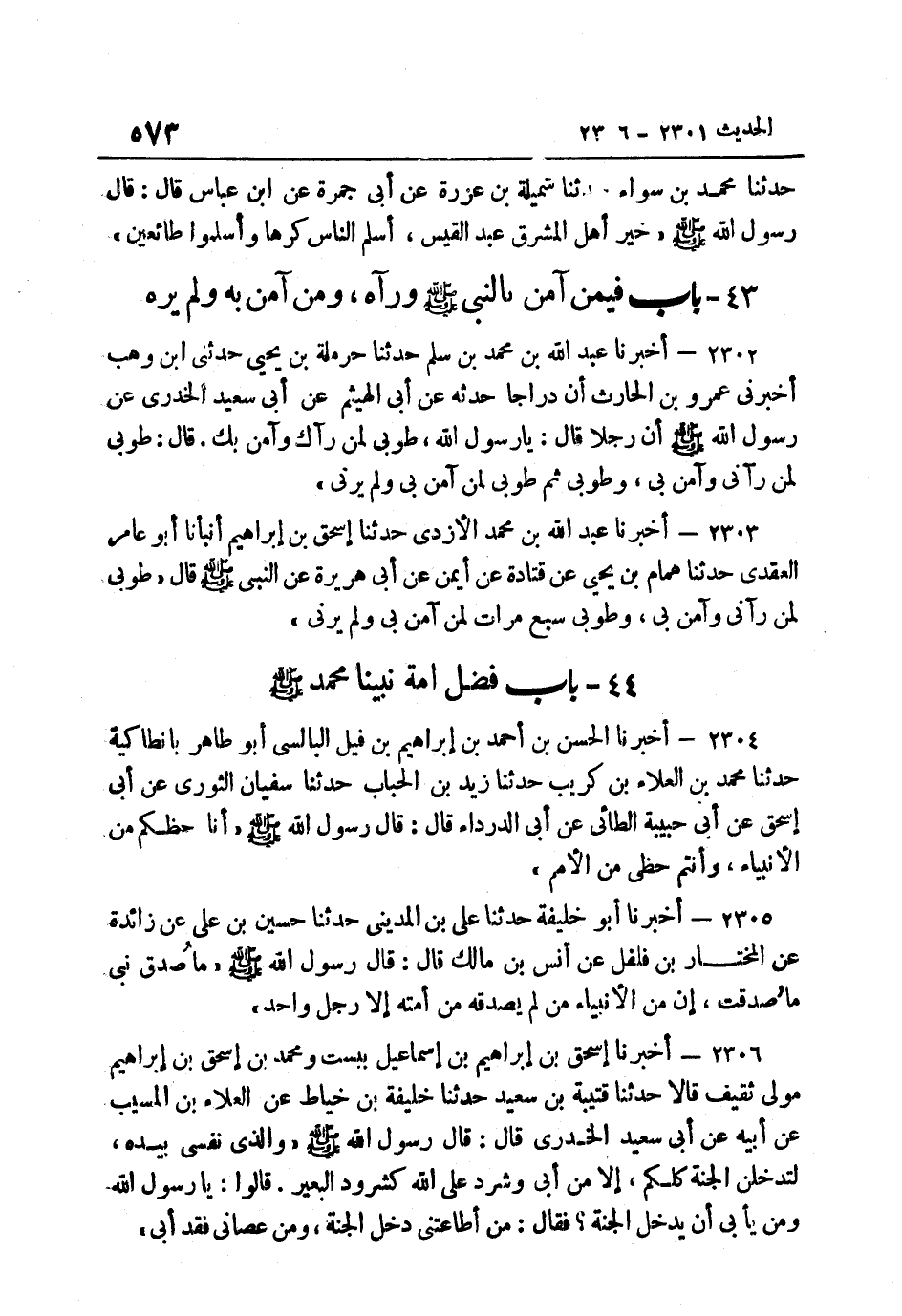 2303- أَخْبَرَنَا عَبْدُ اللَّهِ بْنُ مُحَمَّدٍ الأَزْدِيُّ حَدَّثَنَا إِسْحَاق بن إِبْرَاهِيم أَنبأَنَا أَبُو عَامِرٍ الْعَقَدِيُّ حَدَّثَنَا هَمَّامُ بْنُ يَحْيَى عَنْ قَتَادَةَ عَنْ أَيْمَنٍ عَنْ أَبِي هُرَيْرَةَ عَنِ النَّبِيِّ صَلَّى اللهُ عَلَيْهِ وَسَلَّمَ قَالَ: "طُوبَى لِمَنْ رَآنِي وَآمَنَ بِي وَطُوبَى سَبْعَ مَرَّات لمن آمن بِي وَلم يرني".