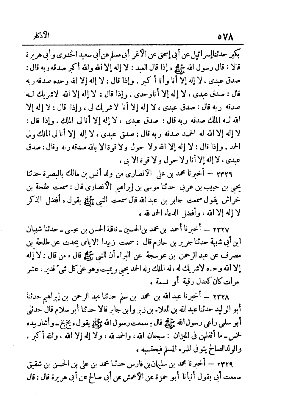2327- أخبرنَا أَحْمد بن مُحَمَّد بن الْحُسَيْن ناقلة الْحسن بن عِيسَى حَدَّثَنَا شَيْبَانُ بْنُ أَبِي شَيْبَةَ حَدَّثَنَا جَرِيرُ بْنُ حَازِمٍ قَالَ سَمِعْتُ زُبَيْدًا الإِيَامِيَّ يُحَدِّثُ عَنْ طَلْحَةَ بْنِ مُصَرِّفٍ عَنْ عَبْدِ الرَّحْمَنِ بْنِ عَوْسَجَةَ عَنِ الْبَرَاءِ أَنّ النَّبِيَّ صَلَّى اللهُ عَلَيْهِ وَسَلَّمَ قَالَ: "مَنْ قَالَ لَا إِلَهَ إِلا اللَّهُ وَحْدَهُ لَا شَرِيكَ لَهُ لَهُ الْمُلْكُ وَلَهُ الْحَمْدُ يُحْيِي وَيُمِيتُ وَهُوَ عَلَى كُلِّ شَيْءٍ قَدِيرٌ عَشْرَ مَرَّاتٍ كَانَ كَعَدْلِ رَقَبَةٍ أَو نسمَة".