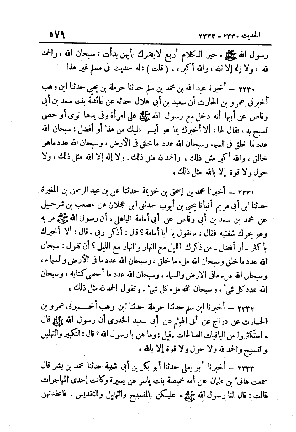 2331- أَخْبَرَنَا مُحَمَّدُ بْنُ إِسْحَاقَ بْنِ خُزَيْمَةَ حَدَّثَنَا عَليّ بن عبد الرَّحْمَن بن الْمُغيرَة حَدثنَا ابْن أبي مَرْيَم أَنبأَنَا يحيى بن أَيُّوب حَدثنِي ابْن عجلَان عَن مُصعب بْنِ شُرَحْبِيلَ عَنْ مُحَمَّدِ بْنِ سَعْدِ بْنِ أَبِي وَقَّاصٍ عَنْ أَبِي أُمَامَةَ الْبَاهِلِيِّ أَنّ رَسُولَ اللَّهِ صَلَّى اللهُ عَلَيْهِ وَسَلَّمَ مَرَّ بِهِ وَهُوَ يُحَرك شَفَتَيْه فَقَالَ: "مَا تَقُولُ يَا أَبَا أُمَامَةَ" قَالَ أَذْكُرُ رَبِّي قَالَ: "أَلا أُخْبِرُكَ بِأَكْثَرَ أَوْ أَفْضَلَ مِنْ ذِكْرِكَ اللَّيْلَ مَعَ النَّهَارِ وَالنَّهَارَ مَعَ اللَّيْلِ أَنْ تَقُولَ سُبْحَانَ اللَّهِ عَدَدَ مَا خَلَقَ وَسُبْحَانَ اللَّهِ مِلْءَ مَا خَلَقَ وَسُبْحَانَ اللَّهِ عَدَدَ مَا فِي الأَرْضِ وَالسَّمَاءِ وَسُبْحَانَ اللَّهِ مِلْءَ مَا فِي الأَرْضِ وَالسَّمَاءِ وَسُبْحَانَ اللَّهِ عَدَدَ مَا أَحْصَى كِتَابُهُ وَسُبْحَانَ اللَّهِ عَدَدَ كُلِّ شَيْءٍ وَسُبْحَانَ اللَّهِ مِلْءَ كُلِّ شَيْءٍ وَتقول الْحَمد لله مثل ذَلِك".