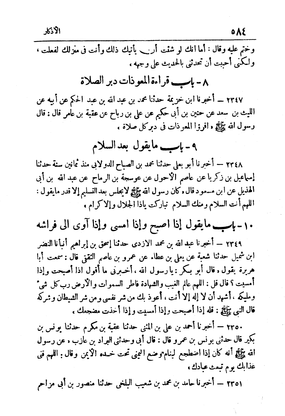 2347- أَخْبَرَنَا ابْن خُزَيْمَة حَدَّثَنَا مُحَمَّدُ بْنُ عَبْدِ اللَّهِ بْنِ عَبْدِ الْحَكَمِ عَنْ أَبِيهِ عَنِ اللَّيْثِ بْنِ سَعْدٍ عَنْ حُنَيْنِ بْنِ أَبِي حَكِيمٍ عَنْ عَلِيِّ بْنِ رَبَاحٍ عَنْ عُقْبَةَ بْنِ عَامِرٍ قَالَ قَالَ رَسُولُ اللَّهِ صَلَّى اللهُ عَلَيْهِ وَسَلَّمَ: "اقرؤا المعوذات فِي دبر كل صَلَاة".