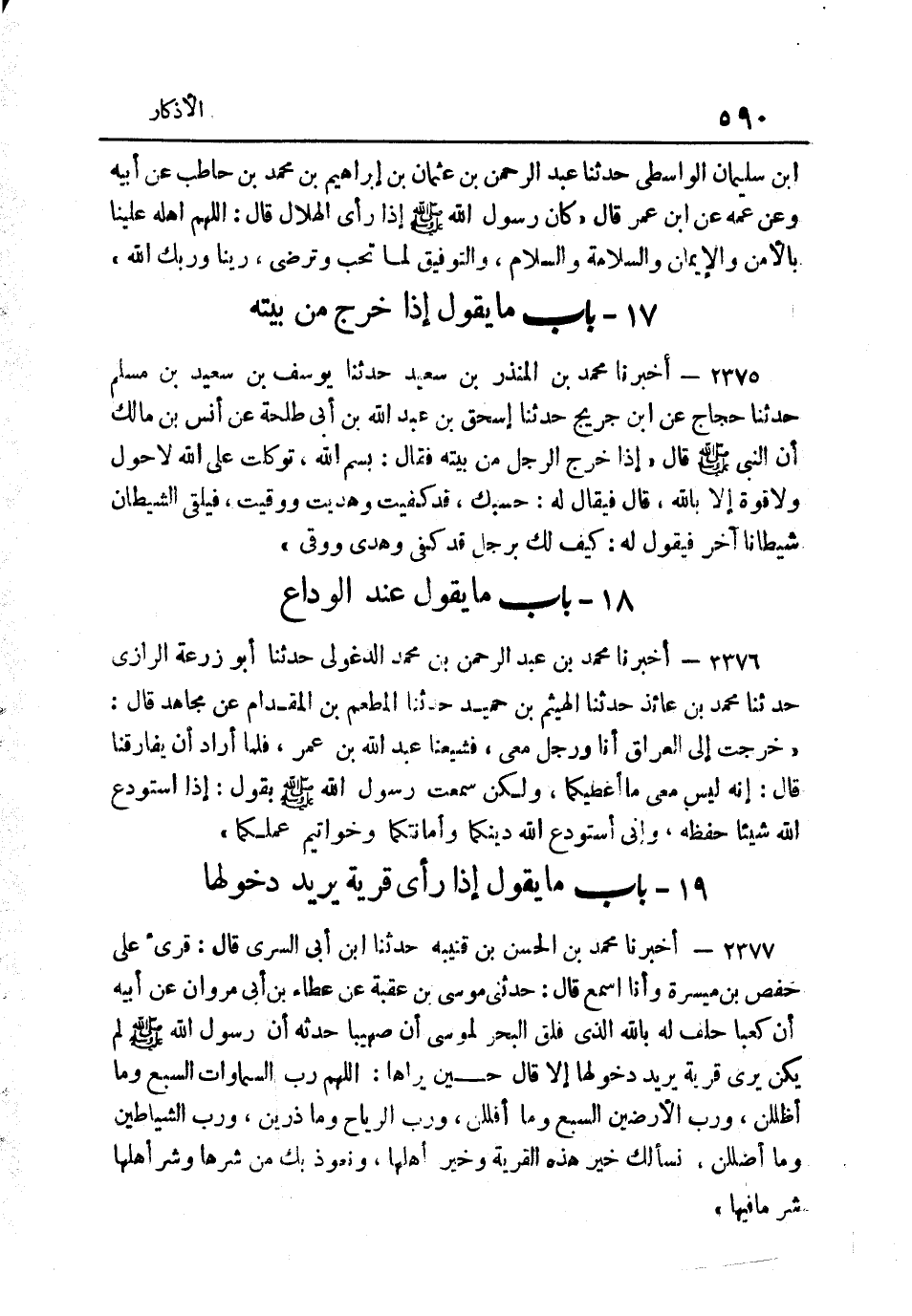 2375- أَخْبَرَنَا مُحَمَّدُ بْنُ الْمُنْذِرِ بْنِ سَعِيدٍ حَدَّثَنَا يُوسُفُ بْنُ سَعِيدِ بْنِ مُسْلِمٍ حَدَّثَنَا حجاج عَن ابْن جريج حَدَّثَنَا إِسْحَاقُ بْنُ عَبْدِ اللَّهِ بْنِ أَبِي طَلْحَةَ عَنْ أَنَسِ بْنِ مَالِكٍ أَنّ النَّبِيَّ صَلَّى اللهُ عَلَيْهِ وَسَلَّمَ قَالَ: "إِذَا خَرَجَ الرجل مِنْ بَيْتِهِ فَقَالَ بِسْمِ اللَّهِ تَوَكَّلْتُ عَلَى الله لَا حول وَلَا قُوَّة إِلَّا بِاللَّه قَالَ فَيُقَالُ لَهُ حَسْبُكَ قَدْ كُفِيتَ وَهُدِيتَ وَوُقِيتَ فَيَلْقَى الشَّيْطَانُ شَيْطَانًا آخَرَ فَيَقُولُ لَهُ كَيْفَ لَك بِرَجُل قد كفي وهدي وَوُقِيَ".