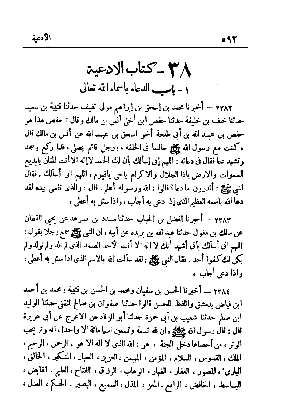 2384- أَخْبَرَنَا الْحَسَنُ بْنُ سُفْيَانَ وَمُحَمَّدُ بْنُ الْحَسَنِ بن قُتَيْبَة وَمُحَمّد بن أَحْمد بن فياض بِدِمَشْق وَاللَّفْظ لِلْحسنِ قَالُوا حَدَّثَنَا صَفْوَان بن صَالح الثَّقَفِيّ حَدثنَا الْوَلِيد بن مُسلم حَدثنَا شُعَيْب بن أبي حَمْزَة حَدَّثَنَا أَبُو الزِّنَادِ عَنِ الأَعْرَجِ عَنْ أَبِي هُرَيْرَةَ قَالَ قَالَ رَسُول الله صَلَّى اللهُ عَلَيْهِ وَسَلَّمَ: "إِنَّ لِلَّهِ تِسْعَةً وَتِسْعِينَ اسْمًا مِائَةً إِلا وَاحِدًا إِنَّهُ وِتْرٌ يُحِبُّ الْوِتْرَ مَنْ أَحْصَاهَا دَخَلَ الْجَنَّةَ هُوَ اللَّهُ الَّذِي لَا إِلَهَ إِلا هُوَ الرَّحْمَنُ الرَّحِيمُ الْمَلِكُ الْقُدُّوسُ السَّلامُ الْمُؤْمِنُ الْمُهَيْمِنُ الْعَزِيزُ الْجَبَّارُ الْمُتَكَبِّرُ الْخَالِقُ الْبَارِئُ الْمُصَوِّرُ الْغَفَّارُ الْقَهَّارُ الْوَهَّابُ الرَّزَّاقُ الْفَتَّاحُ الْعَلِيمُ الْقَابِضُ الْبَاسِطُ الْخَافِضُ الرَّافِعُ الْمُعِزُّ الْمُذِلُّ السَّمِيعُ الْبَصِيرُ الْحَكَمُ الْعَدْلُ
