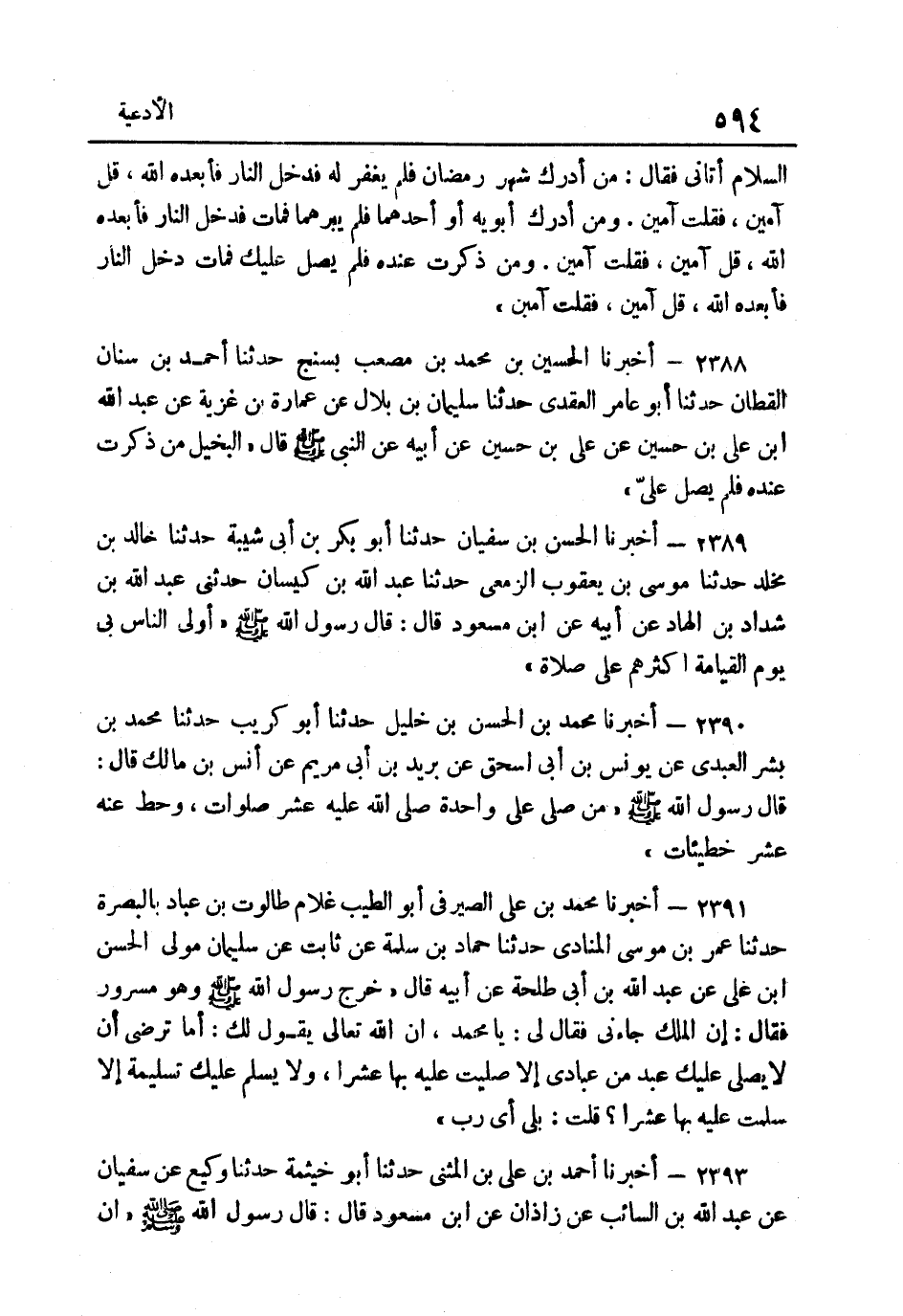2389- أَخْبَرَنَا الْحَسَنُ بْنُ سُفْيَانَ حَدَّثَنَا أَبُو بَكْرِ بْنُ أَبِي شَيْبَةَ حَدَّثَنَا خَالِدُ بْنُ مخلد حَدثنَا مُوسَى بن يَعْقُوب الزمعِي حَدثنَا عبد الله بن كيسَان حَدَّثَنِي عَبْدُ اللَّهِ بْنُ شَدَّادِ بْنِ الْهَادِ عَنْ أَبِيهِ عَنِ ابْنِ مَسْعُودٍ قَالَ قَالَ رَسُولُ اللَّهِ صَلَّى اللهُ عَلَيْهِ وَسَلَّمَ: "أَوْلَى النَّاسِ بِي يَوْمَ الْقِيَامَةِ أَكْثَرُهُمْ عَلَيَّ صَلَاة".