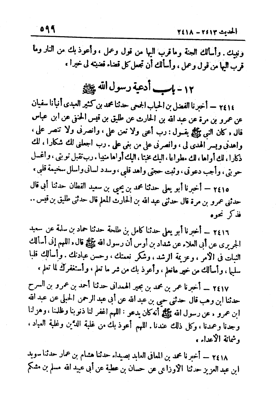 2414- أخبرنَا الْفَضْلُ بْنُ الْحُبَابِ الْجُمَحِيُّ حَدَّثَنَا مُحَمَّدُ بْنُ كثير الْعَبْدي أَنبأَنَا سُفْيَانُ عَنْ عَمْرِو بْنِ مُرَّةَ عَنْ عَبْدِ اللَّهِ بْنِ الْحَارِثِ عَنْ طَلِيقِ بْنِ قَيْسٍ الْحَنَفِيِّ عَنِ ابْنِ عَبَّاسٍ قَالَ كَانَ النَّبِيُّ صَلَّى اللهُ عَلَيْهِ وَسَلَّمَ يَقُولُ: "رَبِّ أَعِنِّي وَلا تُعِنْ عَلَيَّ وَانْصُرْنِي وَلا تَنَصُرْ عَلَيَّ وَاهْدِنِي وَيَسِّرِ الْهُدَى لِي وَانْصُرْنِي عَلَى مَنْ بغى عَليّ رب اجْعَلنِي لَك شكارا لَك ذكارا لَك أواها لَك مطواعا إِلَيْك مخبتا إِلَيْك أَوَّاهًا مُنِيبًا رَبِّ تَقَبَّلْ تَوْبَتِي وَاغْسِلْ حَوْبَتِي وَأَجِبْ دَعْوَتِي وَثَبِّتْ حُجَّتِي وَاهْدِ قَلْبِي وَسَدِّدْ لساني واسلل سخيمة قلبِي".