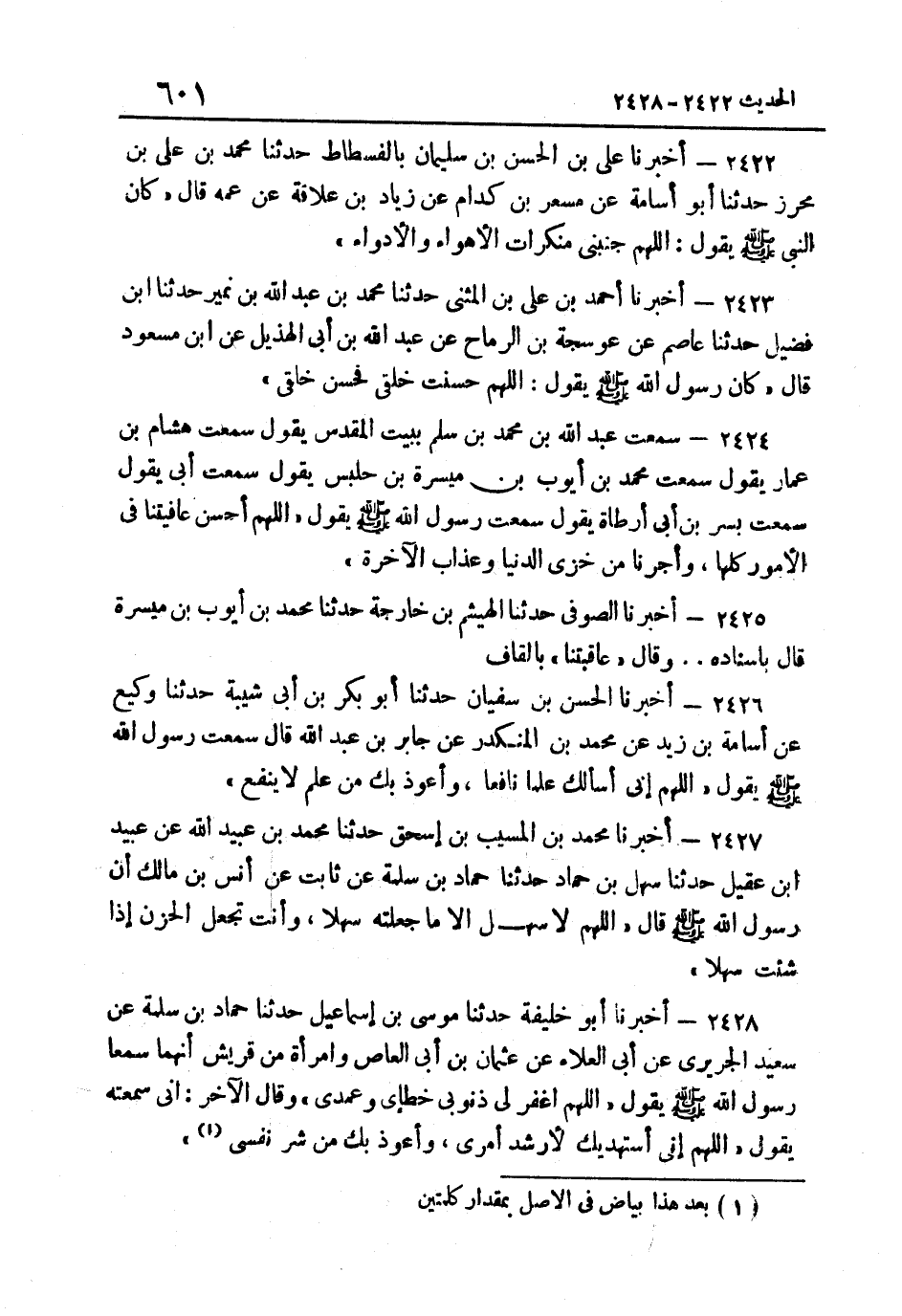 2422- أَخْبَرَنَا عَلِيُّ بْنُ الْحَسَنِ بْنِ سُلَيْمَانَ بِالْفُسْطَاطِ حَدَّثَنَا مُحَمَّدُ بْنُ عَلِيِّ بْنِ مُحْرِزٍ حَدَّثَنَا أَبُو أُسَامَةَ عَنْ مِسْعَرِ بْنِ كِدَامٍ عَنْ زِيَادِ بْنِ عِلاقَةَ عَنْ عَمِّهِ قَالَ كَانَ النَّبِيُّ صَلَّى اللهُ عَلَيْهِ وَسَلَّمَ يَقُولُ: "اللَّهُمَّ جنبني مُنكرَات الْأَهْوَاء والأدواء".
