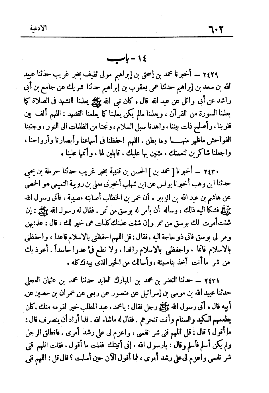 2429- أخبرنَا مُحَمَّد بن إِسْحَاق بن إِبْرَاهِيم مولى ثَقِيف بِخَبَر غَرِيب حَدَّثَنَا عُبَيْدُ اللَّهِ بْنُ سَعْدِ بْنِ إِبْرَاهِيمَ حَدَّثَنَا عَمِّي يَعْقُوب بن إِبْرَاهِيم حَدثنَا شريك عَن جَامع بن أبي رَاشد عَنْ أَبِي وَائِلٍ عَنْ عَبْدِ اللَّهِ قَالَ كَانَ نَبِيُّ اللَّهِ صَلَّى اللهُ عَلَيْهِ وَسَلَّمَ يُعَلِّمُنَا التَّشَهُّدَ فِي الصَّلاةِ كَمَا يُعَلِّمُنَا السُّورَةَ مِنَ الْقُرْآنِ وَيُعَلِّمُنَا مَا لَمْ يَكُنْ يُعَلِّمُنَا كَمَا يُعَلِّمُنَا التَّشَهُّدَ اللَّهُمَّ أَلِّفْ بَيْنَ قُلُوبِنَا وَأَصْلِحْ ذَاتَ بَيْنِنَا وَاهْدِنَا سُبُلَ السَّلامِ وَنَجِّنَا مِنَ الظُّلُمَاتِ إِلَى النُّورِ وَجَنِّبْنَا الْفَوَاحِشَ مَا ظَهْرَ مِنْهَا وَمَا بَطْنَ اللَّهُمَّ احْفَظْنَا فِي أسماعنا وأبصارنا وأرواحنا وَاجْعَلْنَا شَاكِرِينَ لِنِعْمَتِكَ مُثْنِينَ بِهَا عَلَيْكَ قَابِلِينَ لَهَا وأتمها علينا.