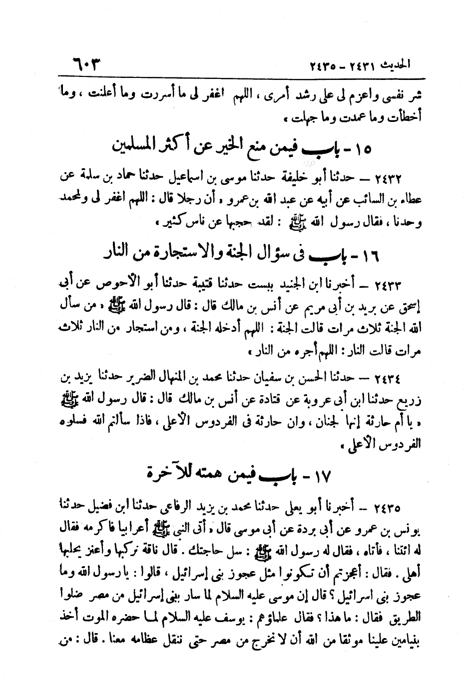 2434- حَدثنَا الْحَسَنُ بْنُ سُفْيَانَ حَدَّثَنَا مُحَمَّدُ بْنُ الْمِنْهَالِ الضَّرِيرُ حَدَّثَنَا يَزِيدُ بن زُرَيْع حَدَّثَنَا ابْنُ أَبِي عَرُوبَةَ عَنْ قَتَادَةَ عَنْ أَنَسِ بْنِ مَالِكٍ قَالَ قَالَ رَسُولُ اللَّهِ صَلَّى اللهُ عَلَيْهِ وَسَلَّمَ: "يَا أُمَّ حَارِثَةَ إِنَّهَا لَجِنَانٌ وَإِنَّ حَارِثَةَ فِي الْفِرْدَوْسِ الأَعْلَى فَإِذا سَأَلْتُم الله فسلوه الفردوس الْأَعْلَى".