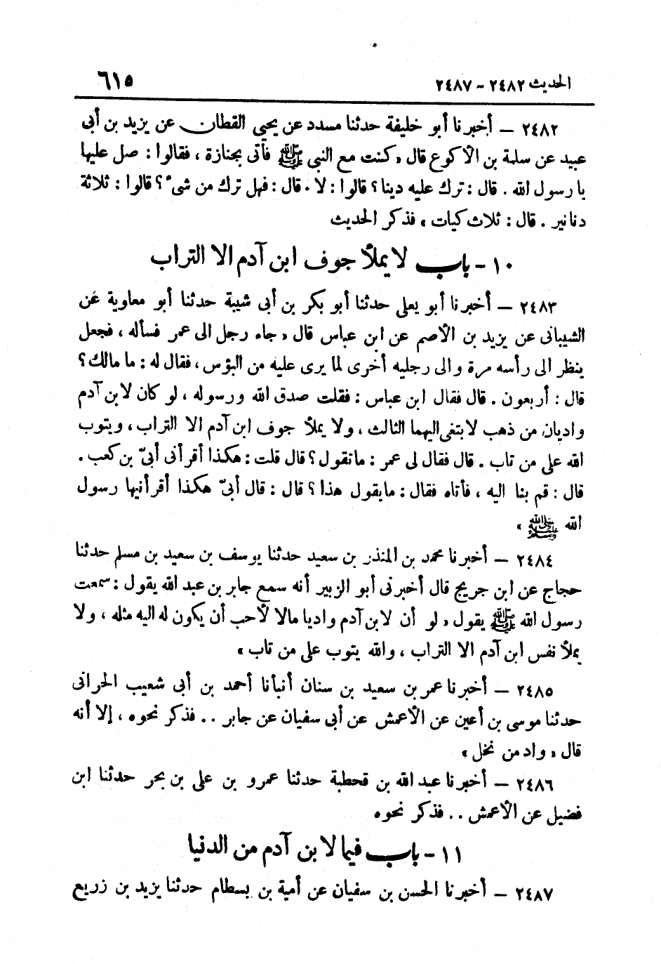2484- أَخْبَرَنَا مُحَمَّدُ بْنُ الْمُنْذِرِ بْنِ سَعِيدٍ حَدَّثَنَا يُوسُفُ بْنُ سَعِيدِ بْنِ مُسْلِمٍ حَدَّثَنَا حَجَّاجٌ عَنِ ابْنِ جُرَيْجٍ قَالَ أَخْبَرَنِي أَبُو الزُّبَيْرِ أَنَّهُ سَمِعَ جَابِرَ بْنَ عَبْدِ اللَّهِ يَقُولُ سَمِعْتُ رَسُولَ اللَّهِ صَلَّى اللهُ عَلَيْهِ وَسَلَّمَ يَقُولُ: "لَوْ أَنَّ لابْنِ آدَمَ وَاديا مَالا لأحب أَن يكون لَهُ إِلَيْهِ مثله وَلَا يمْلَأ نفس ابْن آدم إِلَّا التُّرَاب وَالله يَتُوب عَلَى مَنْ تَابَ".