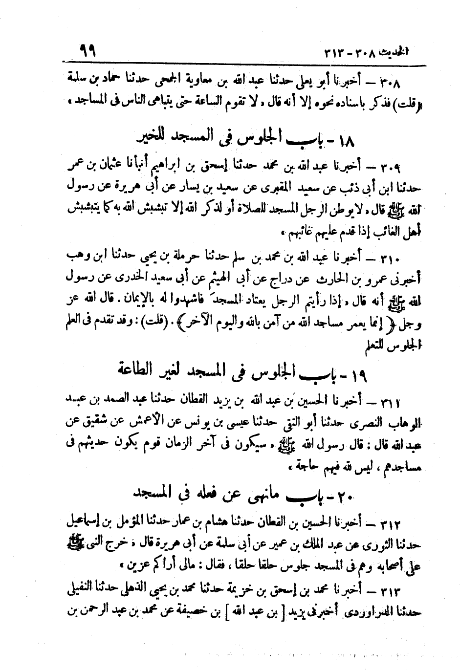 309- أَخْبَرَنَا عَبْدُ اللَّهِ بْنُ مُحَمَّدٍ حَدَّثَنَا إِسْحَاقُ بن إِبْرَاهِيم أَنبأَنَا عُثْمَانُ بْنُ عُمَرَ حَدَّثَنَا ابْنُ أَبِي ذِئْبٍ عَنْ سَعِيدٍ الْمَقْبُرِيِّ عَنْ سَعِيدِ بْنِ يَسَارٍ عَنْ أَبِي هُرَيْرَةَ عَنْ رَسُولِ اللَّهِ صَلَّى اللهُ عَلَيْهِ وَسَلَّمَ قَالَ: "لَا يُوَطِّنُ الرَّجُلُ الْمَسْجِدَ لِلصَّلاةِ أَوْ لِذِكْرِ اللَّهِ إِلا تَبَشْبَشَ اللَّهُ بِهِ كَمَا يَتَبَشْبَشُ أَهْلُ الْغَائِبِ إِذَا قَدِمَ عَلَيْهِمْ غَائِبُهُمْ".