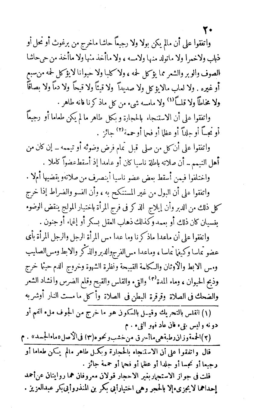 وَاتَّفَقُوا على أَن مَا لم يكن بولا وَلَا رجيعا حاشا مَا خرج من برغوث أَو نحل أَو ذُبَاب وَلَا خمرًا وَلَا مَا تولد مِنْهَا ولامسه وَلَا مَا أَخذ مِنْهَا وَلَا مَا أَخذ من حَيّ حاشا الصُّوف والوبر وَالشعر مِمَّا يُؤْكَل لَحْمه وَلَا كَلْبا وَلَا حَيَوَانا لَا يُؤْكَل لَحْمه من سبع أَو غَيره وَلَا لعاب مَا لَا يُؤْكَل وَلَا صديدا ولا قيئا ولا قيحا ولا دما ولا بصاقا ولا مخاطا ولا قلسا وَلَا مَا مَسّه شَيْء من كل مَا ذكرنَا فانه طَاهِر