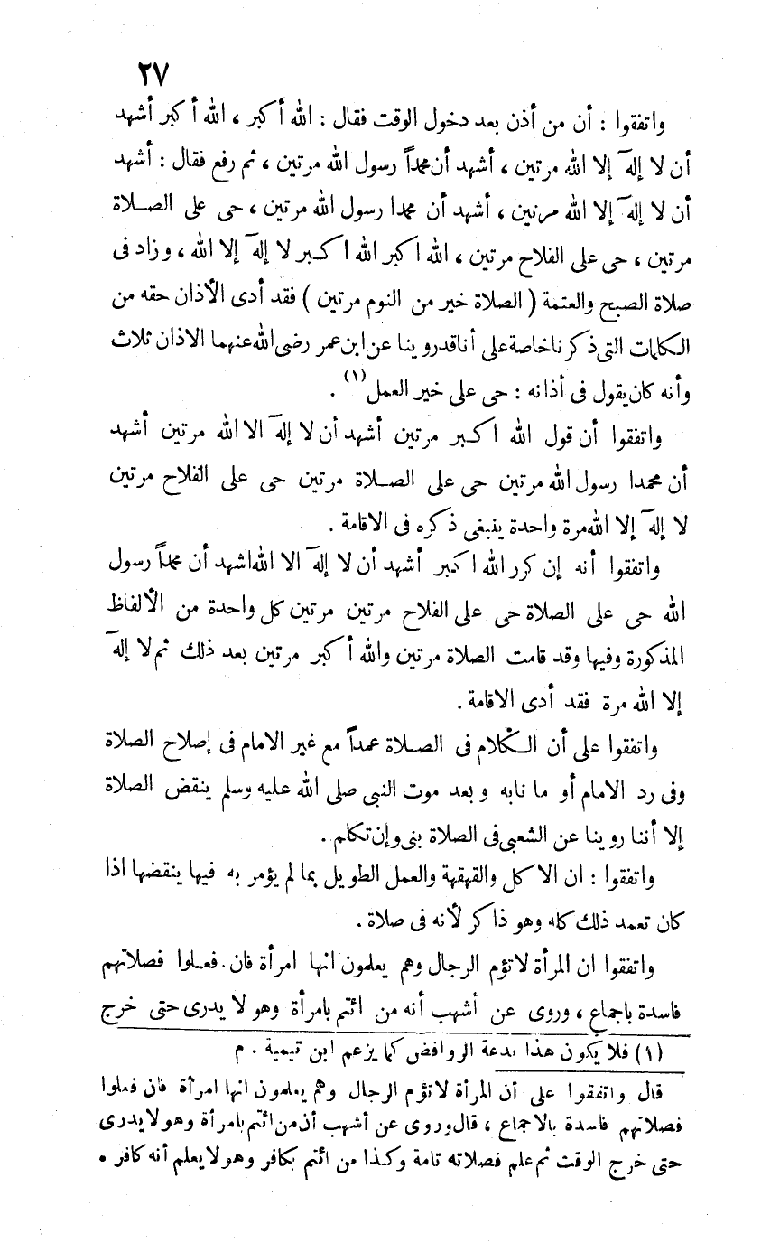 وَاتَّفَقُوا أَن من أذن بعد دُخُول الْوَقْت فَقَالَ الله أكبر الله أكبر أشهد أَن لَا اله إلا الله مرَّتَيْنِ أشهد أَن مُحَمَّدًا رَسُول الله مرَّتَيْنِ ثمَّ رفع فَقَالَ أشهد أَن لَا اله إلا الله مرَّتَيْنِ أشهد أَن مُحَمَّدًا رَسُول الله مرَّتَيْنِ حَيّ على الصَّلَاة مرَّتَيْنِ حَيّ على الْفَلاح مرَّتَيْنِ الله اكبر الله اكبر لَا اله إلا الله وَزَاد فِي صَلَاة الصُّبْح وَالْعَتَمَة الصَّلَاة خير من النّوم مرَّتَيْنِ فقد أدّى الْأَذَان حَقه من الْكَلِمَات الَّتِي ذكرنا خاصة على أَنا قد روينَا عَن ابْن عمر رَضِي الله عَنْهُمَا الأذان ثَلَاث وانه كَانَ يَقُول فِي أَذَانه حَيّ على خير الْعَمَل