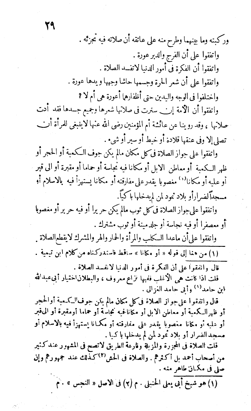 وَاتَّفَقُوا على جَوَاز الصَّلَاة فِي كل مَكَان مَا لم يكن جَوف الْكَعْبَة أَو الْحجر أَو ظهر الْكَعْبَة أَو معاطن الْإِبِل أَو مَكَانا فِيهِ نَجَاسَة أَو حَماما أَو مَقْبرَة أَو إلى قبر أَو عَلَيْهِ أَو مَكَانا مَغْصُوبًا يقدر على مُفَارقَته أَو مَكَانا يستهزأ فِيهِ بالإسلام أَو مَسْجِدا لِضِرَار أَو بِلَاد ثَمُود لمن لم يدخلهَا باكيا (¬2)
