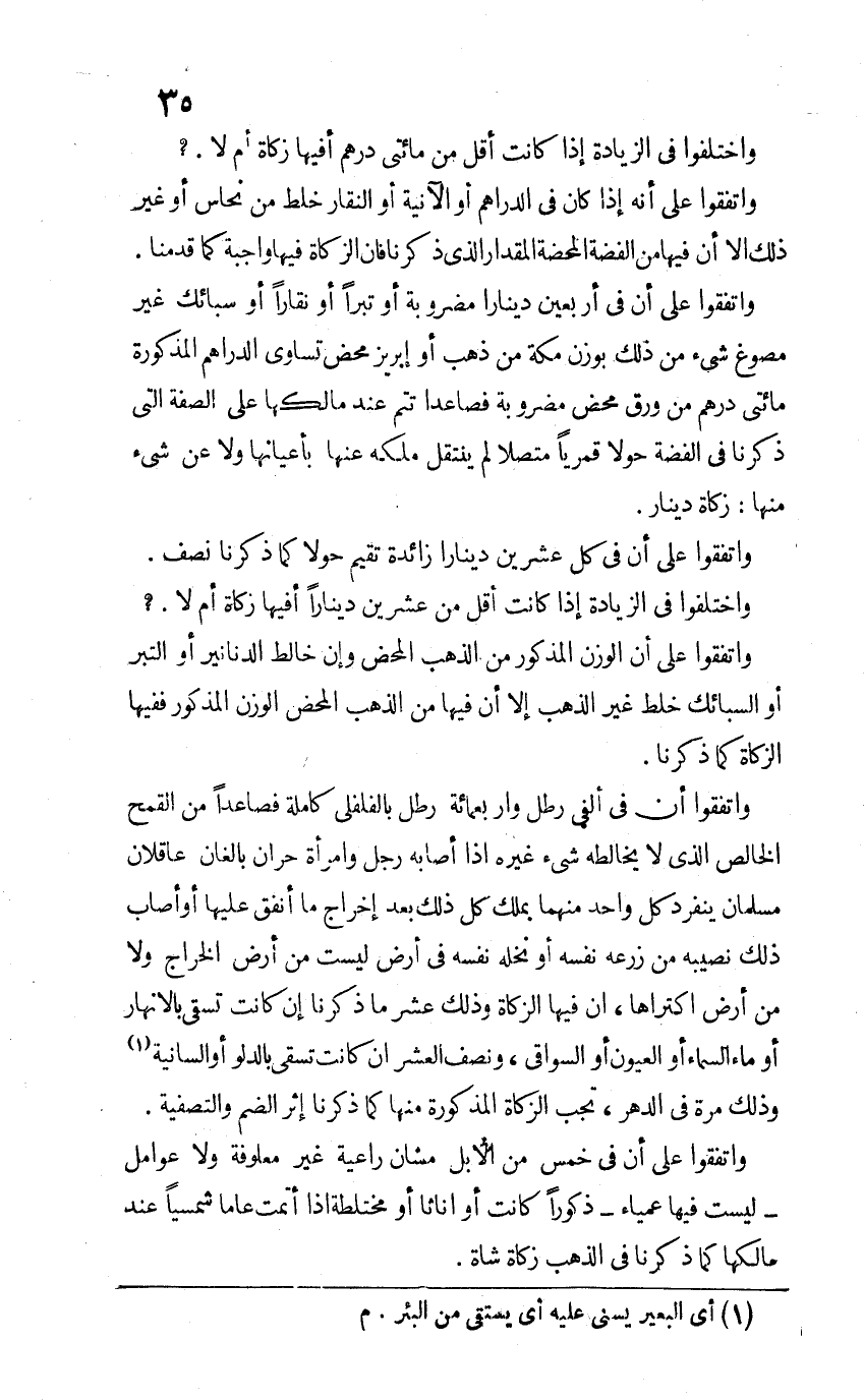 وَاتَّفَقُوا أَن فِي ألفي طل واربعمائة رَطْل بالفلفلي كَامِلَة فَصَاعِدا من الْقَمْح الْخَالِص الَّذِي لَا يخالطه شَيْء غَيره إذا أَصَابَهُ رجل وَامْرَأَة حران بالغان عاقلان مسلمان ينْفَرد كل وَاحِد مِنْهُمَا بِملك كل ذَلِك بعد اخراج مَا أنْفق عَلَيْهَا أَو أصَاب ذَلِك نصِيبه من زرعه نَفسه أَو نخله نَفسه فِي ارْض لَيست من أَرض الْخراج وَلَا من أَرض اكتراها أَن فِيهَا الزَّكَاة وَذَلِكَ عشر مَا ذكرنَا ان كَانَت تسقى بالانهار أَو مَاء السَّمَاء أَو الْعُيُون أَو السواقي وَنصف الْعشْر ان كَانَت تسقى بالدلو أَو السانية وَذَلِكَ مرّة فِي الدَّهْر تجب الزَّكَاة الْمَذْكُورَة مِنْهَا كَمَا ذكرنَا اثر الضَّم والتصفية