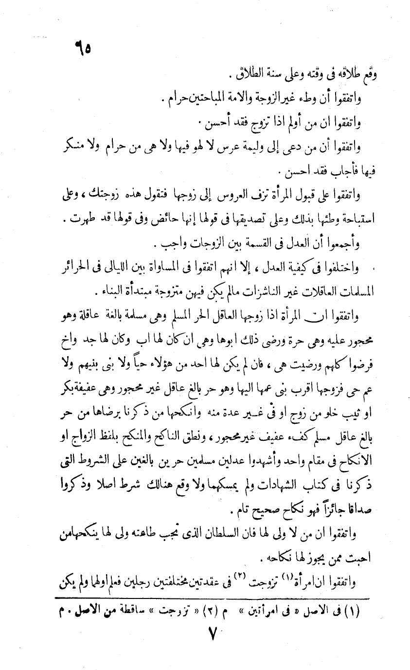 وَاتَّفَقُوا ان الْمَرْأَة إذا زَوجهَا الْعَاقِل الْحر الْمُسلم وَهِي مسلمة بَالِغَة عَاقِلَة وَهُوَ مَحْجُور عَلَيْهِ وَهِي حرَّة وَرَضي ذَلِك أَبوهَا وَهِي ان كَانَ لَهَا اب وَكَانَ لَهَا جد واخ فرضوا كلهم ورضيت هِيَ فان لم يكن لَهَا اُحْدُ من هَؤُلَاءِ حَيا وَلَا بنى بنيهم وَلَا عَم حَيّ فَزَوجهَا اقْربْ بنى عَمها اليها وَهُوَ حر بَالغ عَاقل غير مَحْجُور وَهِي عفيفة بكر أَو ثيب خلو من زوج أَو فِي غير عدَّة مِنْهُ وانكحها من ذكرنَا بِرِضَاهَا من حر بَالغ عَاقل مُسلم كُفْء عفيف غير مَحْجُور ونطق الناكح والمنكح بِلَفْظ الزواج أَو الانكاح فِي مقَام وَاحِد وَأشْهدُوا عَدْلَيْنِ مُسلمين حُرَّيْنِ بالغين على الشُّرُوط الَّتِي ذكرنَا فِي كتاب الشَّهَادَات وَلم يمسكهما وَلَا وَقع هُنَالك شَرط أصلا وَذكروا صَدَاقا جَائِزا فَهُوَ نِكَاح صَحِيح تَامّ