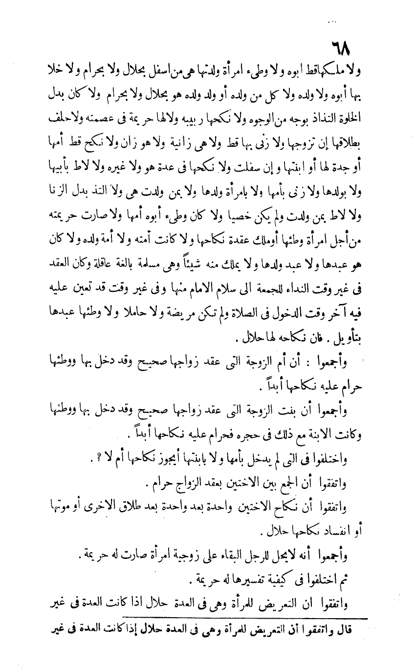 وَلَا ملكهَا قطّ ابوه وَلَا وطئ امْرَأَة ولدتها هِيَ من اسفل بحلال ولابحرام وَلَا خلا بهاأبوه وَلَا وَلَده وَلَا كل من وَلَده أَو ولد وَلَده هُوَ بحلال وَلَا بِحرَام وَلَا كَانَ بدل الْخلْوَة التذاذ بِوَجْه من الْوُجُوه وَلَا نَكَحَهَا ربيبه وَلَا لَهَا حريمة فِي عصمته وَلَا حلف بِطَلَاقِهَا ان تزَوجهَا وَلَا زنى بهَا قطّ وَلَا هِيَ زَانِيَة وَلَا هُوَ زَان وَلَا نكح قطّ أمهَا أَو جدة لَهَا أَو ابنتهاوان سفلت وَلَا نَكَحَهَا فِي عدَّة هُوَ وَلَا غَيره وَلَا لَاطَ بابيهاولا بِوَلَدِهَا وَلَا زنى بأمها وَلَا بِامْرَأَة وَلَدهَا وَلَا بِمن ولدت هِيَ وَلَا التذ بدل الزِّنَا وَلَا لَاطَ بِمن ولدت وَلم يكن خَصيا وَلَا كَانَ وطئ أَبوهُ أمهَا وَلَا صَارَت حريمته من اجل امْرَأَة وَطئهَا أَو ملك عقدَة نِكَاحهَا وَلَا كَانَت أمته وَلَا أمة وَلَده وَلَا كَانَ هُوَ عَبدهَا وَلَا عبد وَلَدهَا وَلَا يملك مِنْهُ شَيْئا وَهِي مسلمة بَالِغَة عَاقِلَة وَكَانَ العقد فِي غير وَقت النداء للْجُمُعَة إلى سَلام الامام مِنْهَا وَفِي غير وَقت قد تعين عَلَيْهِ فِيهِ آخر وَقت الدُّخُول فِي الصَّلَاة وَلم تكن مَرِيضَة وَلَا حَامِلا وَلَا وَطئهَا عَبدهَا بِتَأْوِيل فان نِكَاحه لَهَا حَلَال