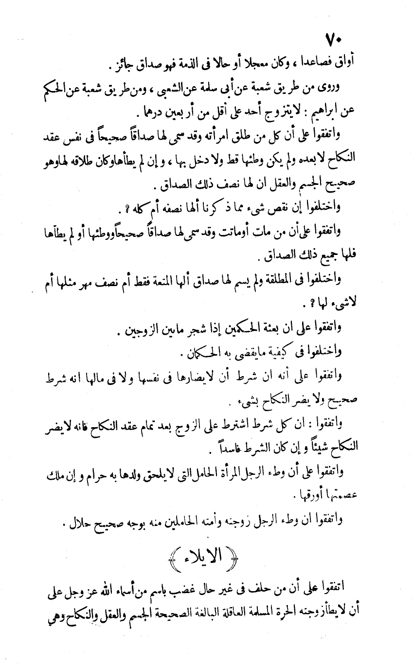 اتَّفقُوا على أَن من حلف فِي غير حَال غضب باسم من أَسمَاء الله عز وَجل على أَن لَا يطَأ زَوجته الْحرَّة الْمسلمَة الْعَاقِلَة الْبَالِغَة الصَّحِيحَة الْجِسْم وَالْعقل وَالنِّكَاح وَهِي