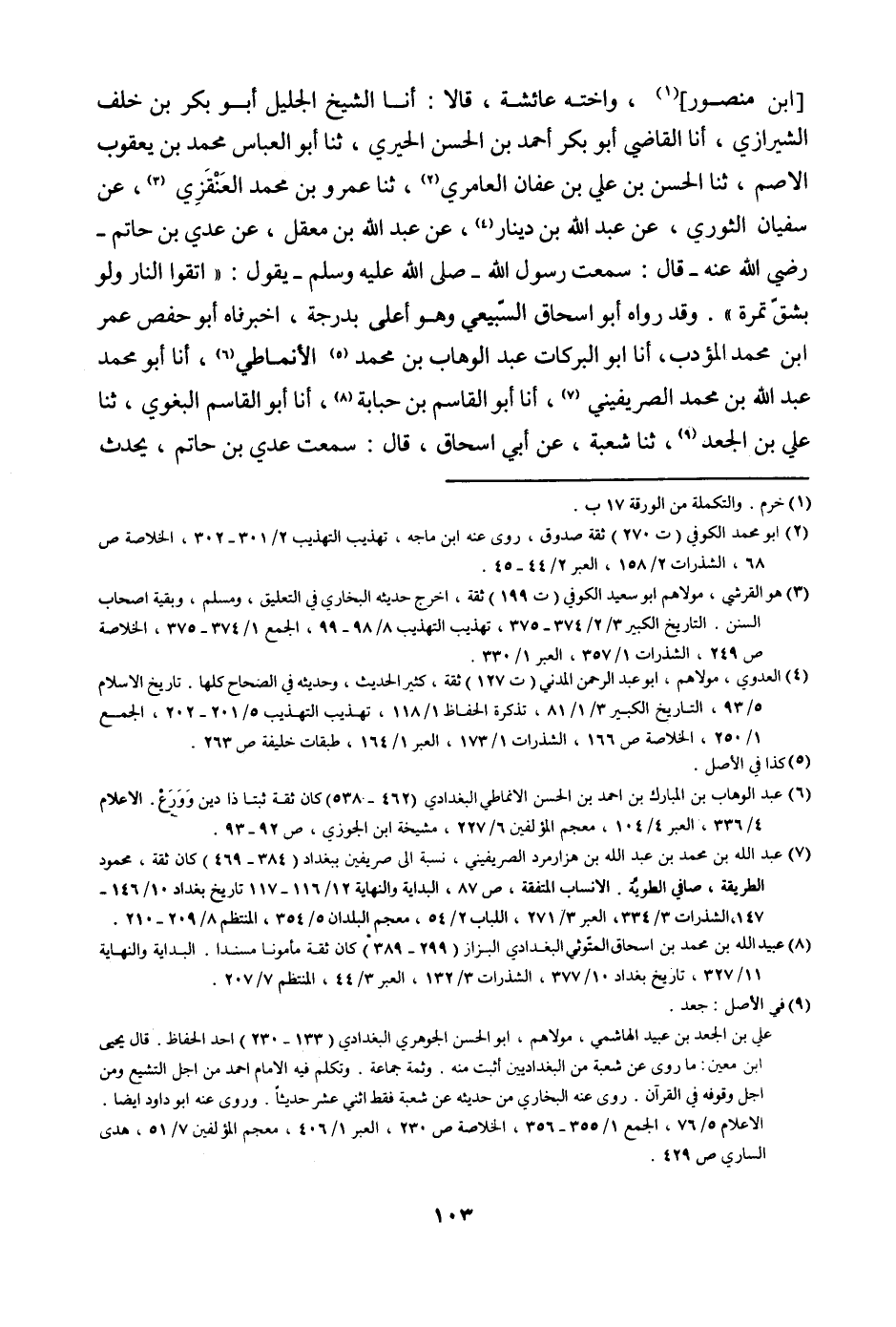 [ابن منصور] ، وأخته عائشة، قالا: أنا الشيخ الجليل أبو بكر بن خلف الشيرازي، أنا القاضي أبو بكر أحمد بن الحسن الحيري، ثنا أبو العباس محمد بن يعقوب الأصم، ثنا الحسن بن علي بن عفان العامري، ثنا عمرو بن محمد العنقزي، عن سفيان الثوري، عن عبد الله بن دينار، عن عبد الله بن معقل، عن عدي بن حاتم -رضي الله عنه- قال: سمعت رسول الله - صلى الله عليه وسلم - يقول: ((اتقوا النار ولو بشق تمرة)) . وقد رواه أبو إسحاق السبيعي وهو أعلى بدرجة، أخبرناه أبو حفص عمر ابن محمد المؤدب، أنا أبو البركات عبد الوهاب بن محمد الأنماطي، أنا أبو محمد عبد الله بن محمد الصريفيني، أنا أبو القاسم بن حبابة، أنا أبو القاسم البغوي، ثنا علي بن الجعد، ثنا شعبة، عن أبي إسحاق، قال: سمعت عدي بن حاتم، يحدث