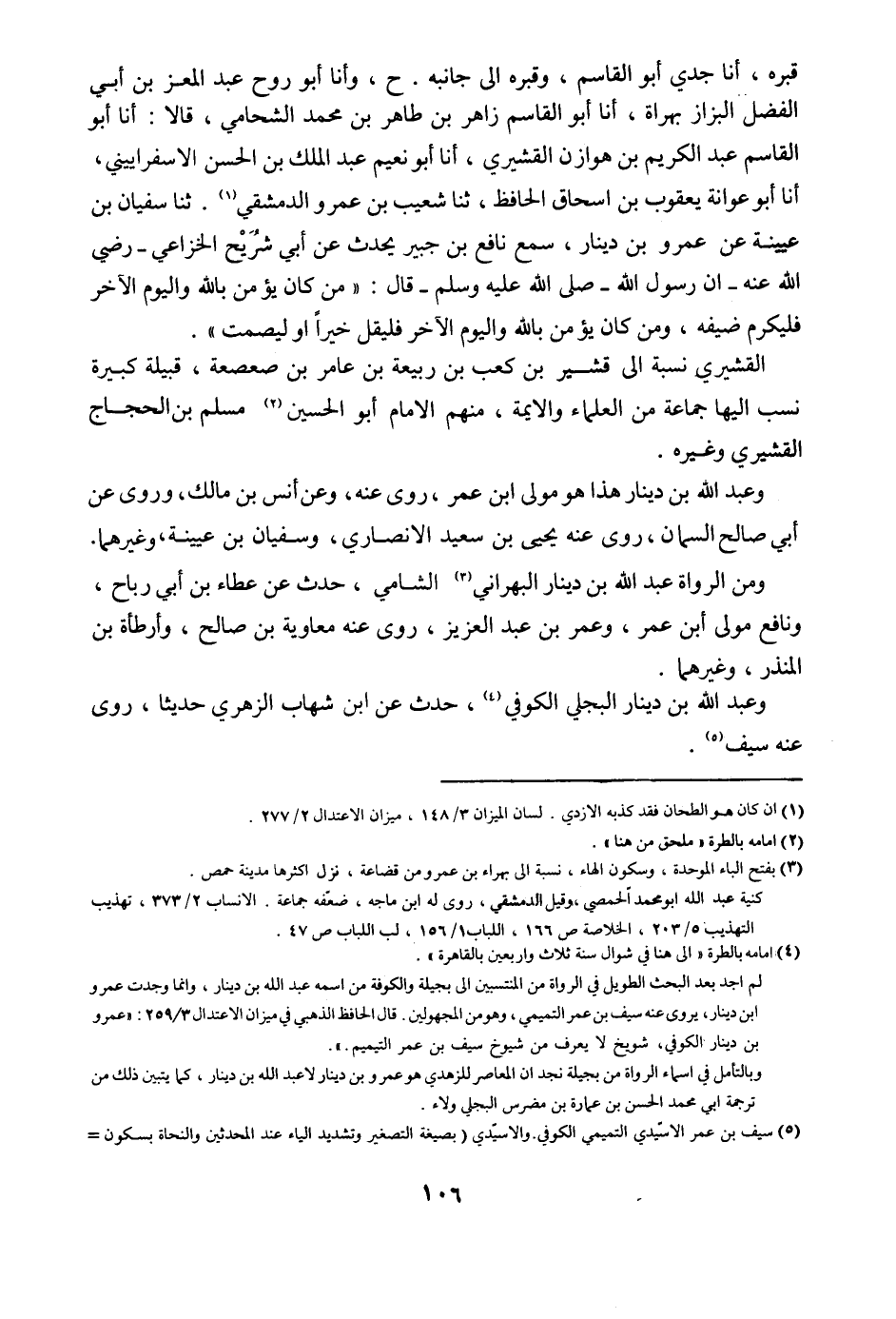 قبره، أنا جدي أبو القاسم، وقبره إلى جانبه. ح، وأنا أبو روح عبد المعز بن أبي الفضل البزاز بهراة، أنا أبو القاسم زاهر بن طاهر بن محمد الشحامي، قالا: أنا أبو القاسم عبد الكريم بن هوازن القشيري، أنا أبو نعيم عبد الملك بن الحسن الإسفراييني، أنا أبو عوانة يعقوب بن إسحاق الحافظ، ثنا شعيب بن عمرو الدمشقي. ثنا سفيان بن عيينة عن عمرو بن دينار، سمع نافع بن جبير يحدث عن أبي شريح الخزاعي -رضي الله عنه-أن رسول الله - صلى الله عليه وسلم - قال: ((من كان يؤمن بالله واليوم الآخر فليكرم ضيفه، ومن كان يؤمن بالله واليوم الآخر فليقل خيراً أو ليصمت)) .