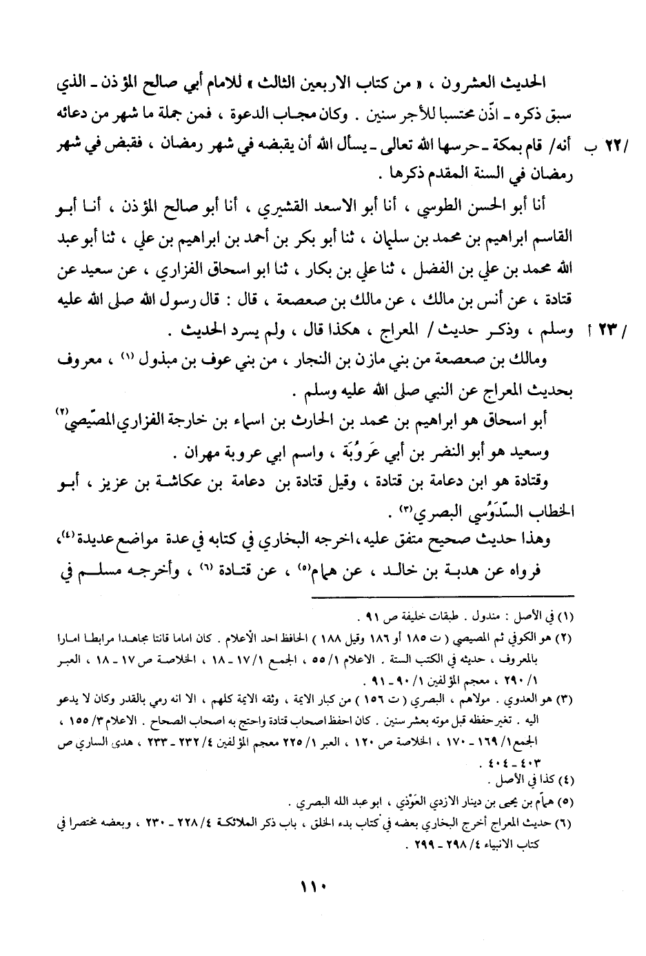 أنا أبو الحسن الطوسي، أنا أبو الأسعد القشيري، أنا أبو صالح المؤذن، أنا أبو القاسم إبراهيم بن محمد بن سليمان، ثنا أبو بكر بن أحمد بن إبراهيم بن علي، ثنا أبو عبد الله محمد بن علي بن الفضل، ثنا علي بن بكار، ثنا أبو إسحاق الفزاري، عن سعيد عن قتادة، عن أنس بن مالك، عن مالك بن صعصعة، قال: قال رسول الله صلى الله عليه وسلم، وذكر حديث المعراج، هكذا قال: ولم يسرد الحديث.